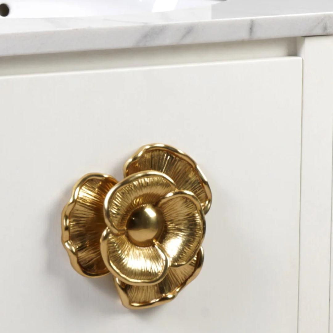La grande maniglia a forma di fiore in ottone del lavabo da appoggio floreale in ottone bianco e oro è uno splendido elemento decorativo che crea un piacevole contrasto con la finitura bianca smerigliata. All'interno, il lavabo include un ripiano regolabile e un vassoio in legno opzionale che può essere fissato all'interno dell'anta. Il piano è in marmo bianco di Carrara ed è dotato di un lavabo ovale bianco sottotop. Ulteriori elementi di design includono cerniere per ante con chiusura ammortizzata e un paraschizzi in marmo coordinato. Il mobiletto bianco Briallen da 30' è inoltre dotato di una maniglia a forma di fiore in ottone di dimensioni impressionanti, un abbellimento sorprendente che contrasta con la finitura nero caviale.