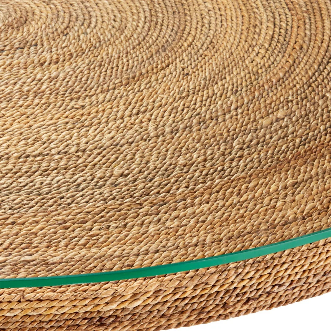 Con la sua forma scultorea a calice rovesciato, il tavolo da bistrot in corda di abaca intrecciata a mano dona calore e consistenza a qualsiasi ingresso. Avvolto in corda di abaca intrecciata a mano e sormontato da un vetro trasparente, mette in risalto la naturalezza della lavorazione artigianale e lascia trasparire l'intricata trama.