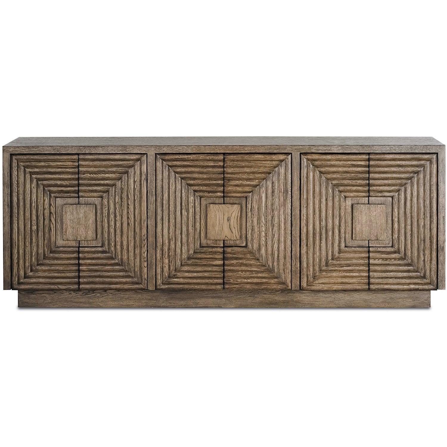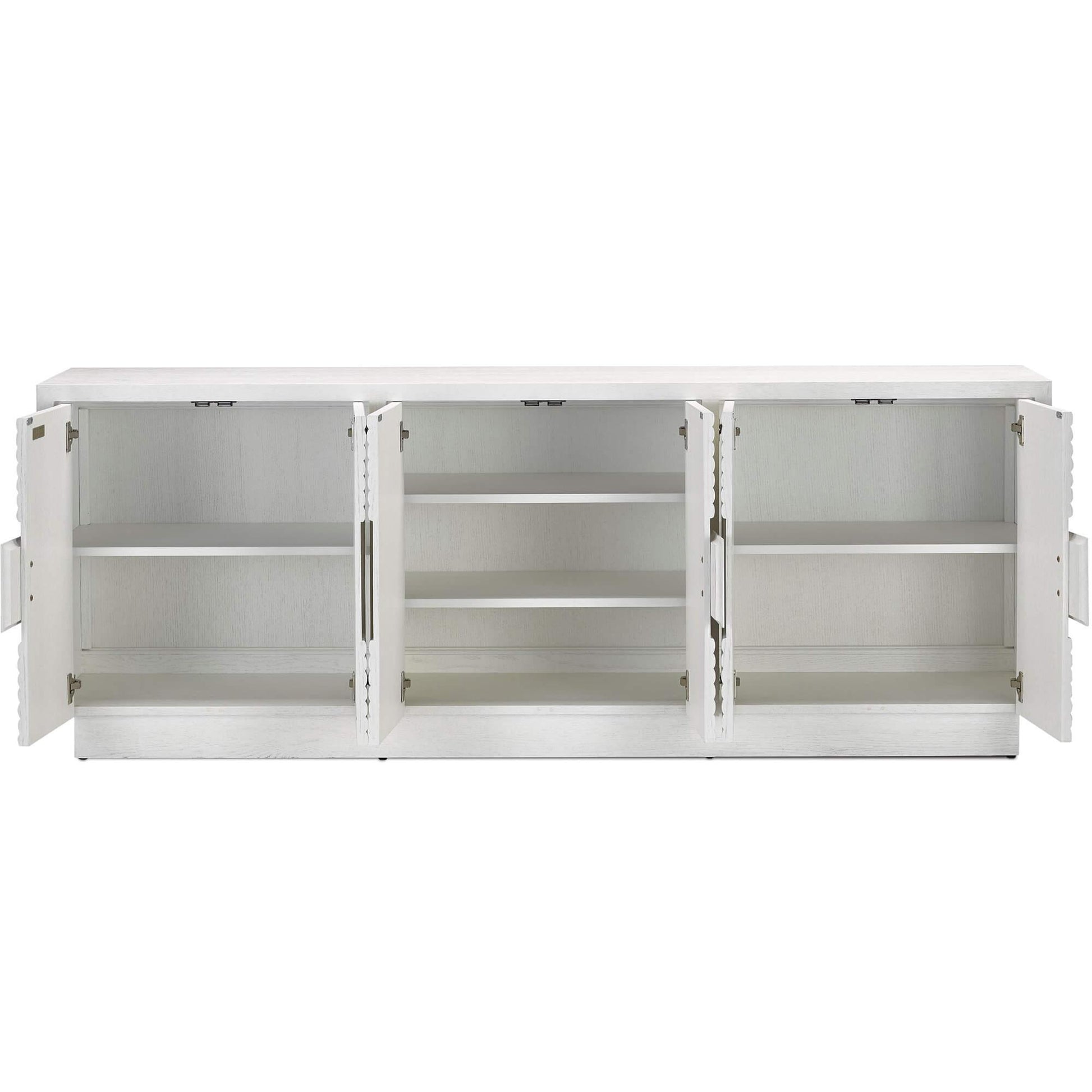 La credenza Modern Illusion White vanta un motivo geometrico a quadrati sulle sei ante in rovere bianco, che conferisce profondità. La finitura bianco satinato rende questa credenza contemporanea adatta a qualsiasi schema cromatico, mentre i due ripiani regolabili offrono spazio nascosto per riporre i vostri oggetti preferiti.