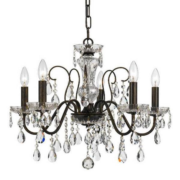 Stupisci i tuoi ospiti con questo lampadario in cristallo ispirato al mercatino delle pulci di Parigi. La struttura in acciaio presenta un tradizionale design ad arco con finitura in bronzo inglese. Le gocce e gli accenti in cristallo trasparente Swarovski Spectra conferiscono a questo lampadario glamour parigino un aspetto davvero sbalorditivo. 5 lampadine illumineranno la tua sala da pranzo o l'ingresso, trasformando questo pezzo nel punto focale della tua visione di design.