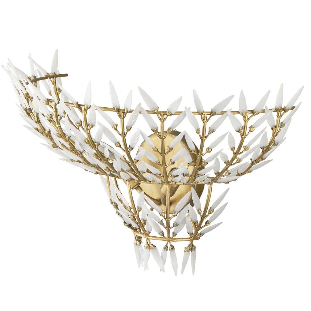 Realizzata con la massima precisione, l'applique da parete Vintage Glass Leaves presenta un'intricata disposizione di delicate foglie di vetro, che scendono a cascata con grazia da steli metallici che si curvano elegantemente attorno alla piastra a parete. Quando accese, queste foglie di vetro emettono un'accattivante effervescenza, trasformando questa applique in un capolavoro scultoreo. L'interazione tra il vetro bianco e la raffinata finitura in ottone conferisce una qualità tattile a questo lussuoso pezzo, infondendo a qualsiasi ambiente una radiosa luminosità.