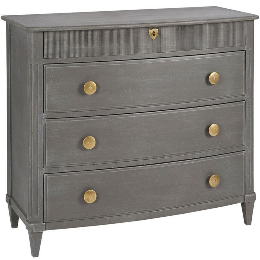 La cassettiera Country a 3 cassetti con frontale curvo esalterà lo stile della tua camera da letto o del tuo soggiorno. Gli accenti intagliati a mano lungo le gambe sono ricchi e affascinanti. La finitura antracite contrasta con le parti in ottone per un look raffinato. Riponi i tuoi oggetti nei 3 cassetti o nascondi gli oggetti di valore nel vano superiore con serratura.