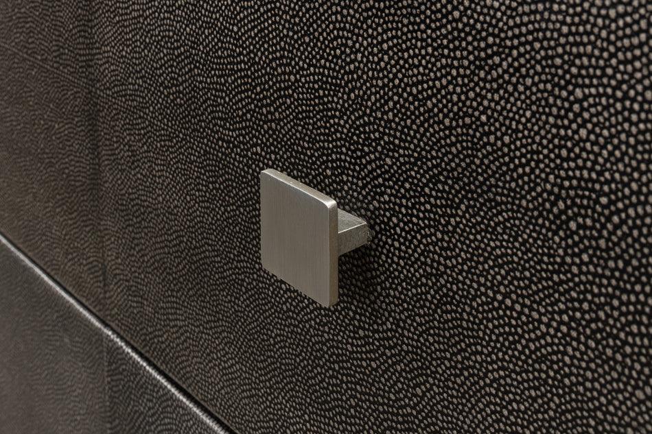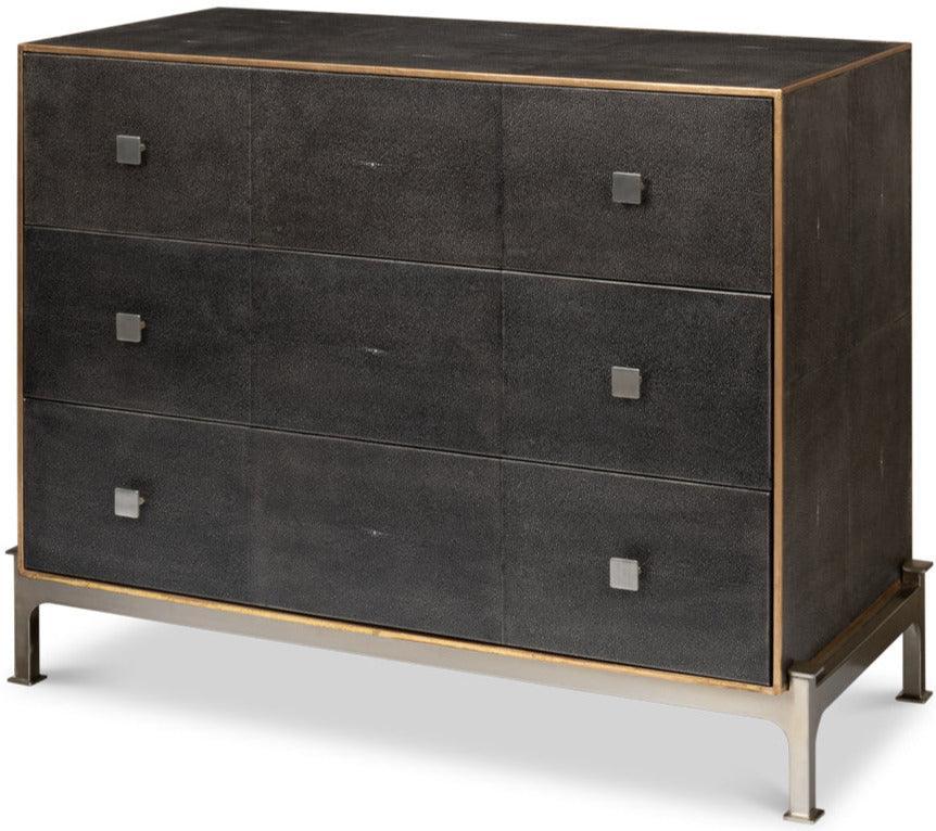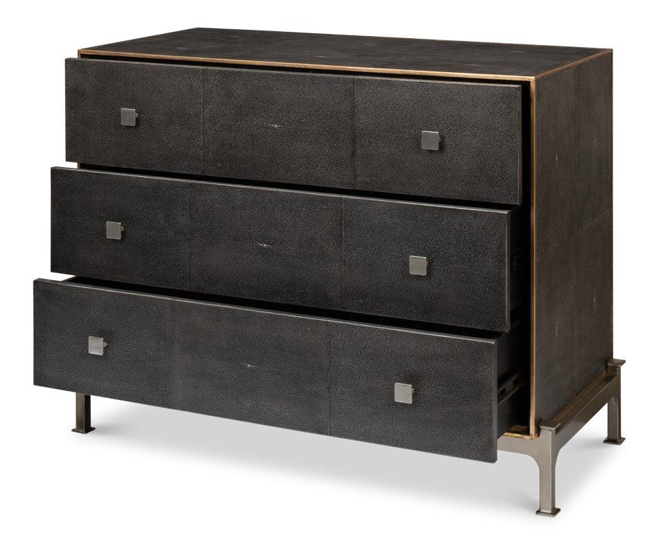 La cassettiera moderna a 3 cassetti in pelle di galuchat scuro è tutt'altro che noiosa. La pelle di galuchat scuro avvolge questa splendida cassettiera con una texture meravigliosa. Le ferramenta squadrate in ferro aggiungono un tocco di eleganza, mentre i bordi dorati le conferiscono un tocco glamour contemporaneo. Riponi i tuoi vestiti o altri oggetti in 3 ampi cassetti.