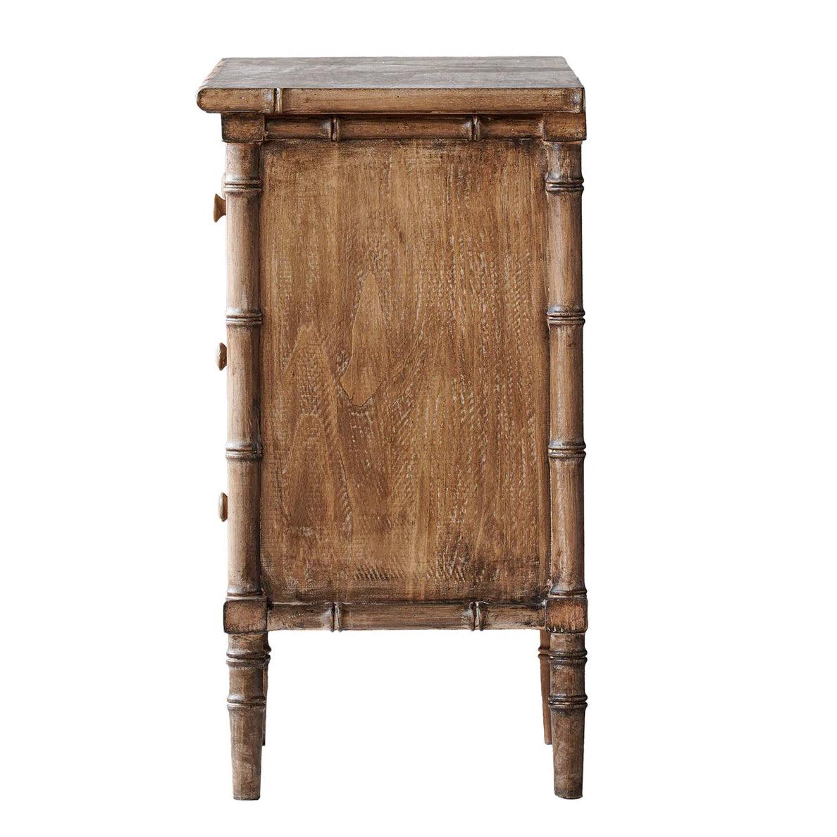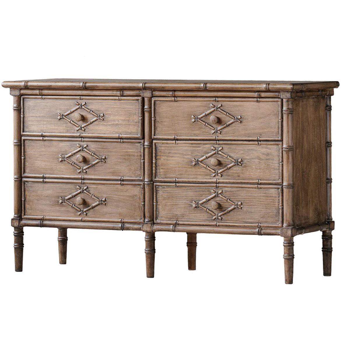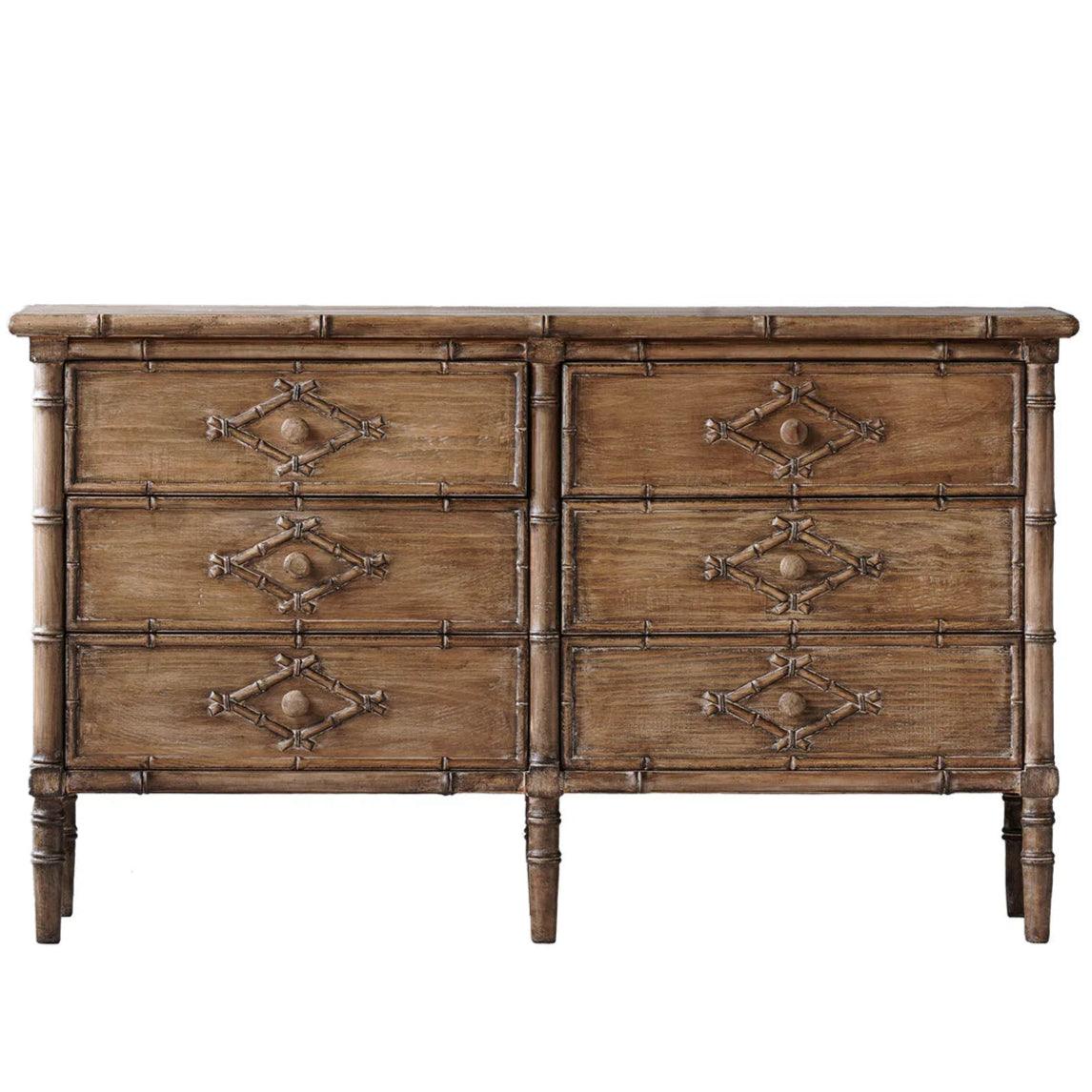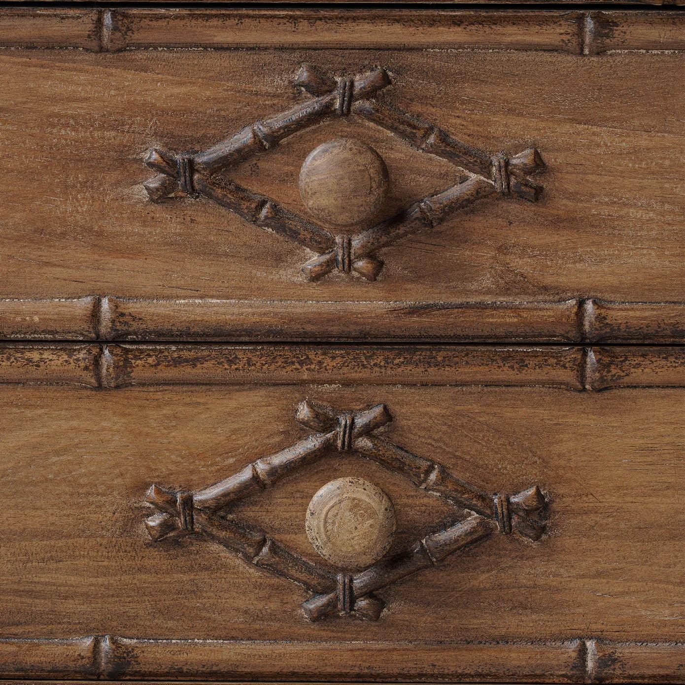 Lasciatevi conquistare dal raffinato equilibrio tra chiaro e scuro con la cassettiera doppia in finto bambù naturale anticato con finitura naturale anticata. Realizzata con cura in legno di pino di recupero, la cassettiera in finto bambù riproduce l'aspetto e la sensazione del bambù su gambe e bordi. Eleganti dettagli a forma di diamante impreziosiscono i pomelli in legno di ogni cassetto, mentre i ganci garantiscono una chiusura sicura. Un'eleganza senza pari è vostra con la cassettiera in finto bambù con finitura naturale anticata e i suoi sei ampi cassetti.