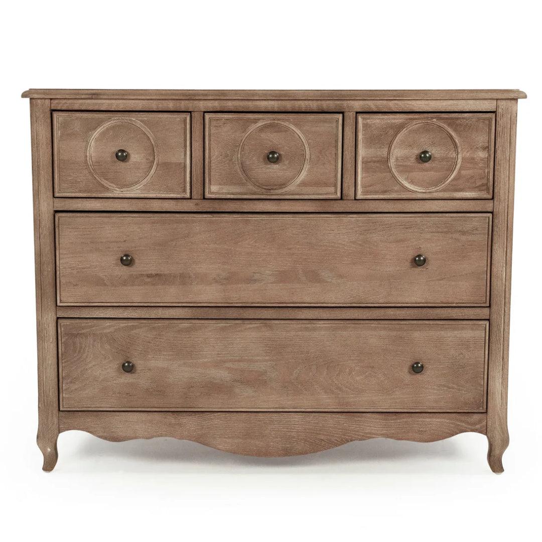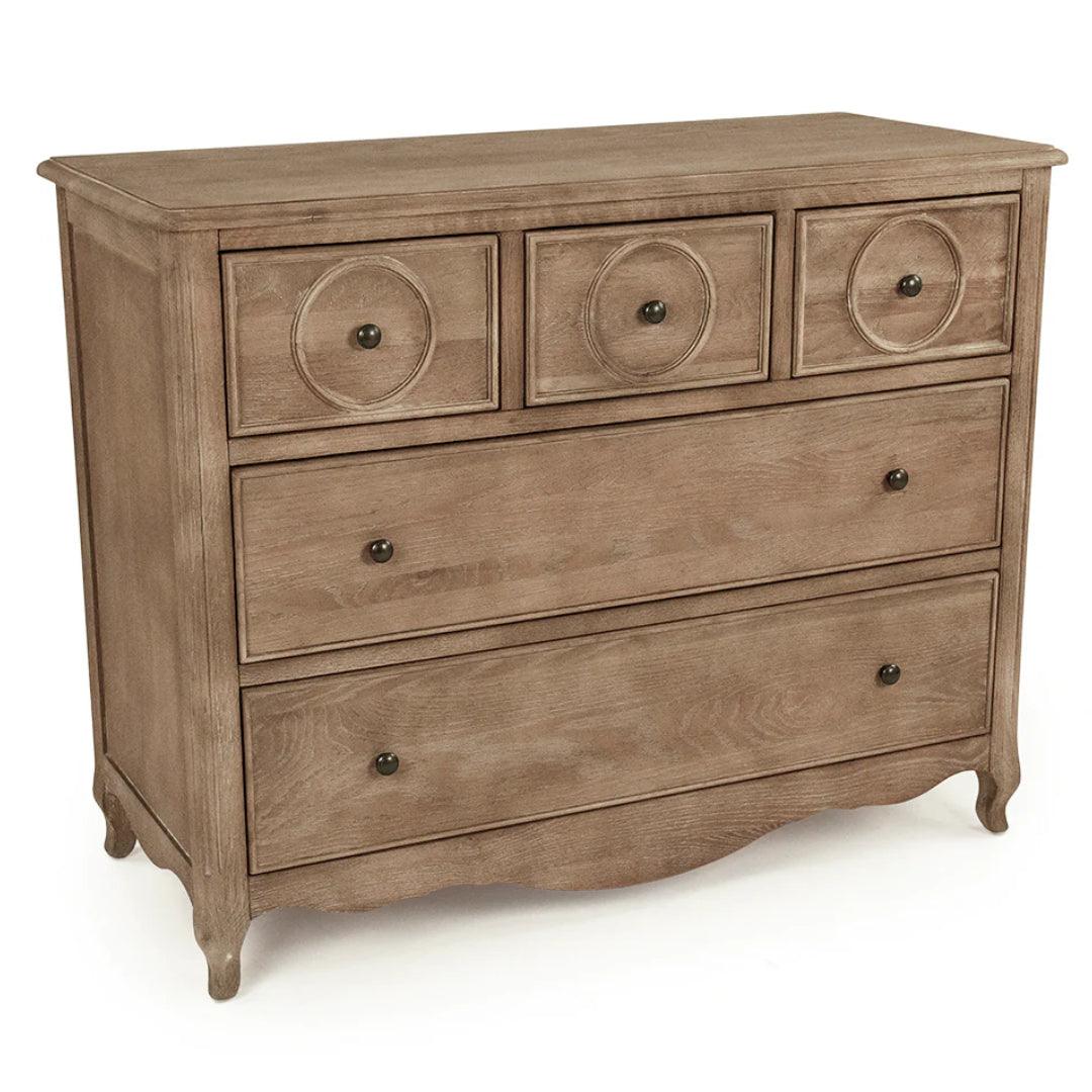 Questa cassettiera in rovere grigio "Farmhouse Chic" ha un affascinante stile rustico, leggermente elegante. È in rovere grigio con una finitura che lascia intravedere le venature del legno. Ha tre cassetti piccoli e due grandi per un ampio spazio di archiviazione. Presenta semplici maniglie rotonde, un bordo inferiore ondulato e gambe curve, che le conferiscono un aspetto classico che si adatta bene a una camera da letto, un soggiorno o un corridoio.