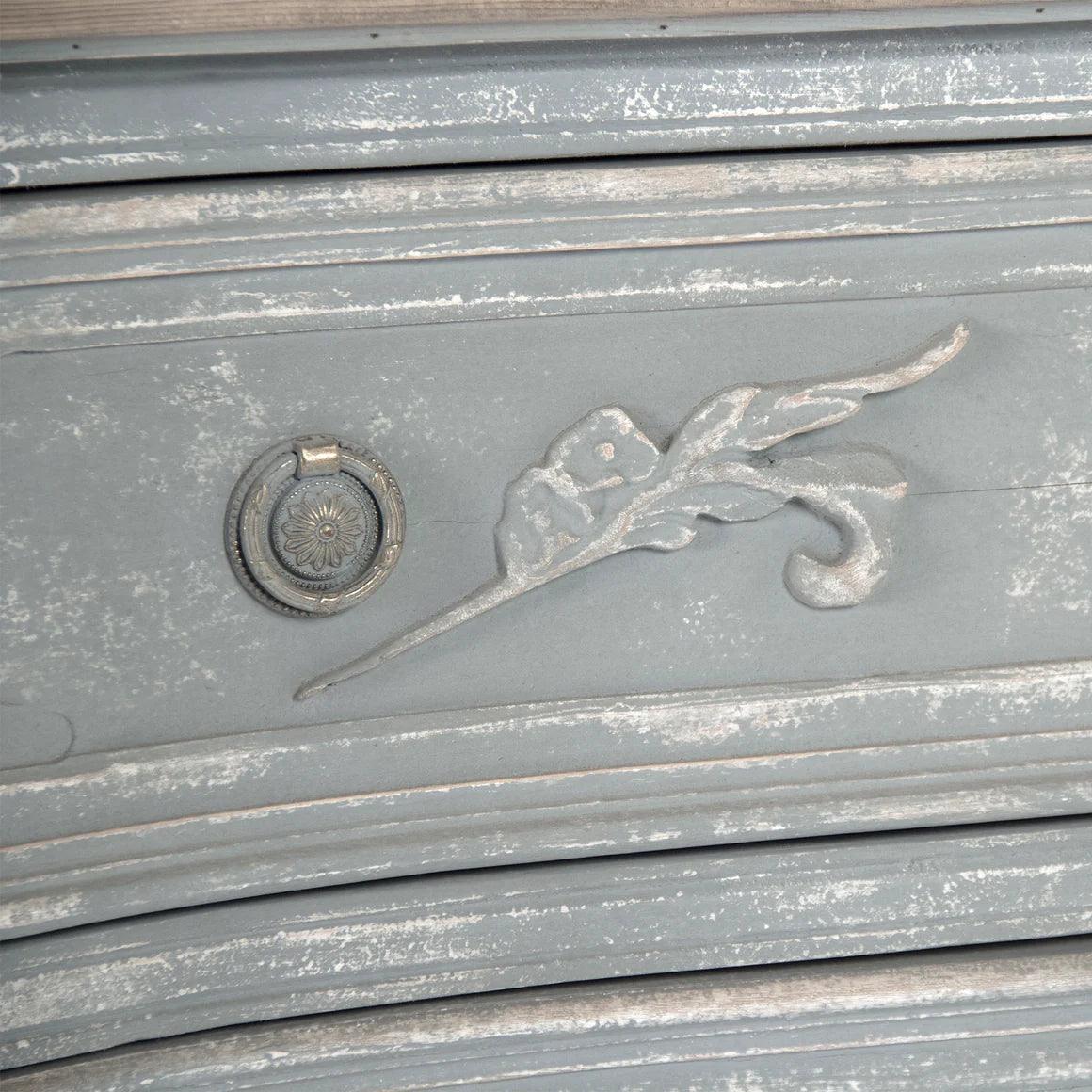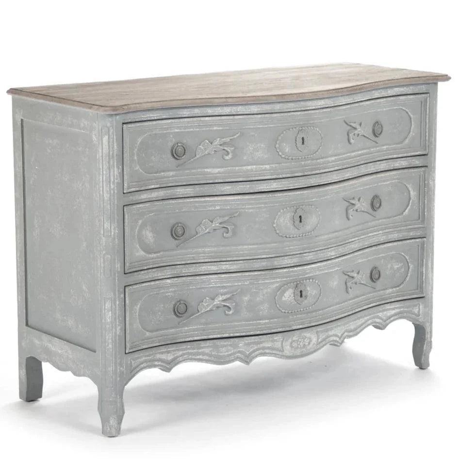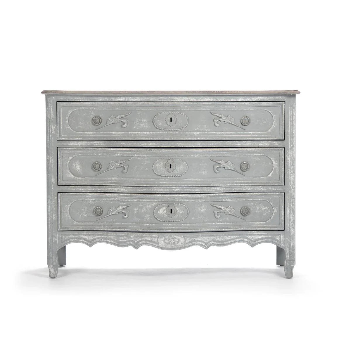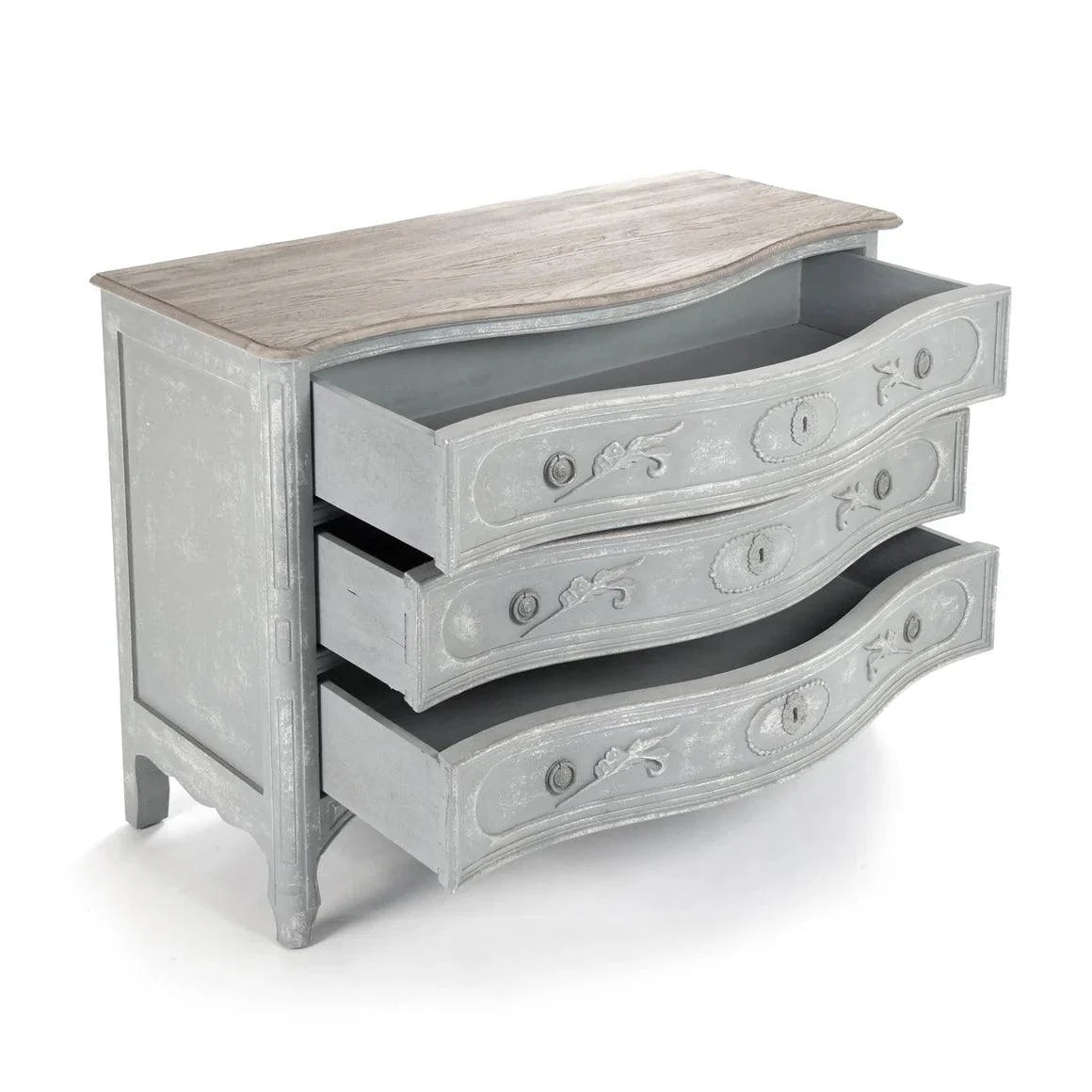 Vuoi dare alla tua casa quell'atmosfera accogliente e lussuosa tipica delle fattorie francesi? Dai un'occhiata a questa splendida cassettiera grigia. Presenta dei graziosi dettagli sinuosi nella parte inferiore e un piano superiore in legno rustico che aggiunge un tocco di fascino. Ha anche delle finiture in stile anticato che la rendono davvero bella. Inoltre, ha tre grandi cassetti, quindi avrai un sacco di spazio per riporre le tue cose. È un pezzo davvero elegante e sofisticato che può rendere la tua casa ancora più speciale.