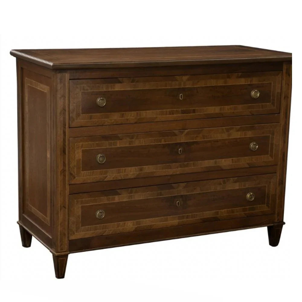 Valorizza il tuo spazio con questa cassettiera in noce, realizzata in legno massello con intarsi dettagliati. Tre ampi cassetti con maniglie ad anello in ottone e dettagli a forma di serratura offrono stile e spazio. Le gambe affusolate scanalate e i pannelli classici la rendono ideale per ambienti tradizionali o di transizione.