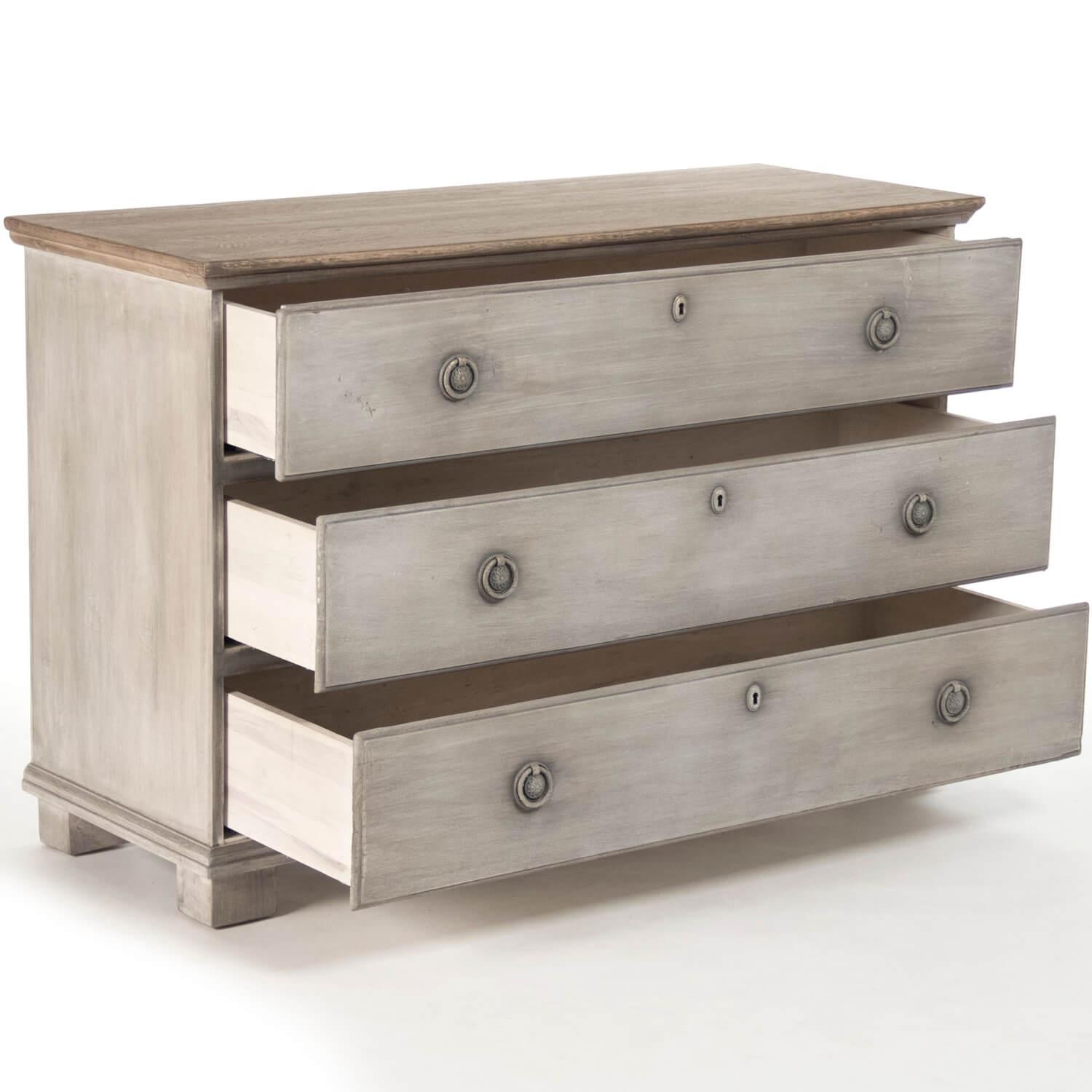 Realizzata con una splendida combinazione di legno massello di pioppo e pino, questa cassettiera sbiancata con serratura è dotata di tre ampi cassetti in cui riporre oggetti essenziali di ogni tipo. Con una graziosa maniglia ad anello e serrature in stile antico sui frontali dei cassetti, questa cassettiera ha un piano in legno naturale e poggia su piedini a forma di panino quadrato. Elegante ma sobria, è una graziosa aggiunta a quasi ogni stanza che necessiti di ulteriore spazio.