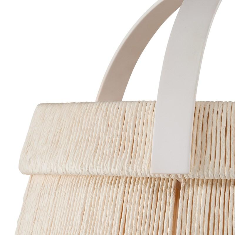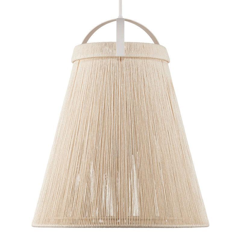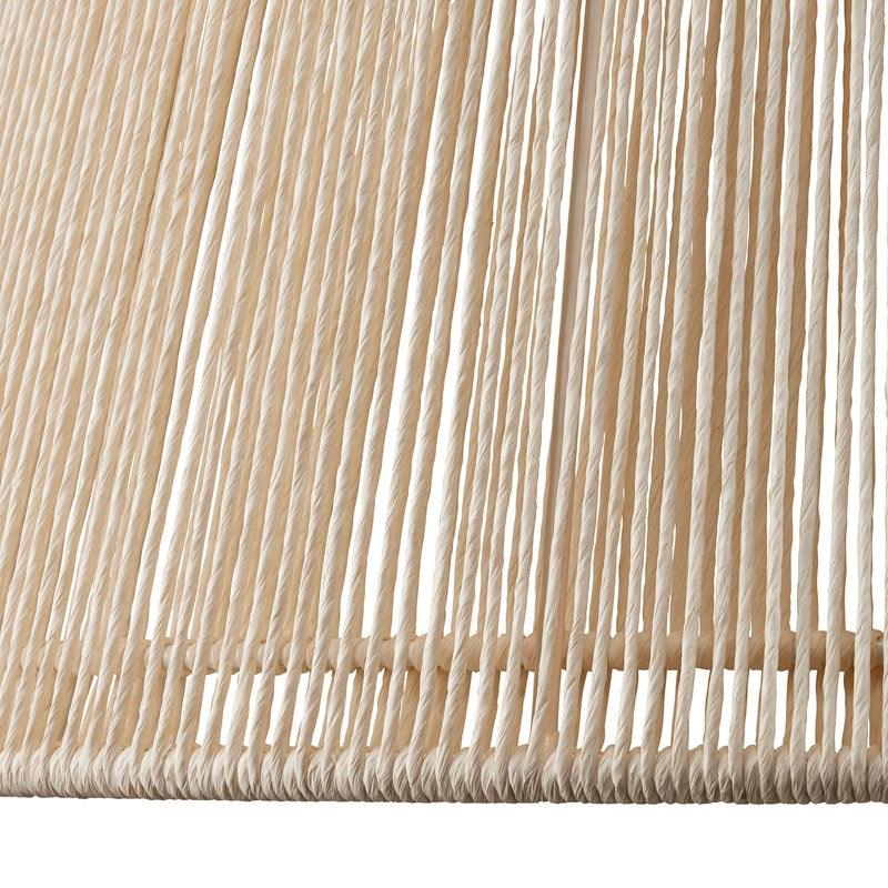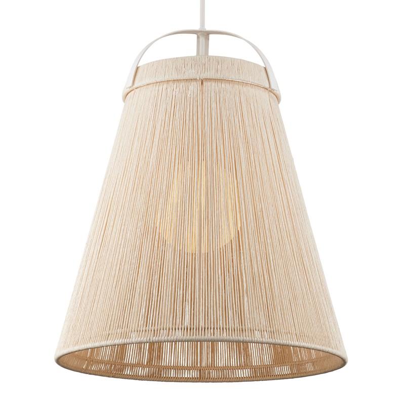 Questo squisito pendente a forma di costa avvolto in spago, realizzato da Clarence Mallari, ricorda una grande campana. Lo spago di carta kraft, accuratamente avvolto in un doppio strato, aggiunge un tocco raffinato alla struttura in ferro battuto con finitura bianco gesso. Il bellissimo globo in vetro bianco satinato completa questo splendido pendente, diffondendo una luce morbida e seducente.