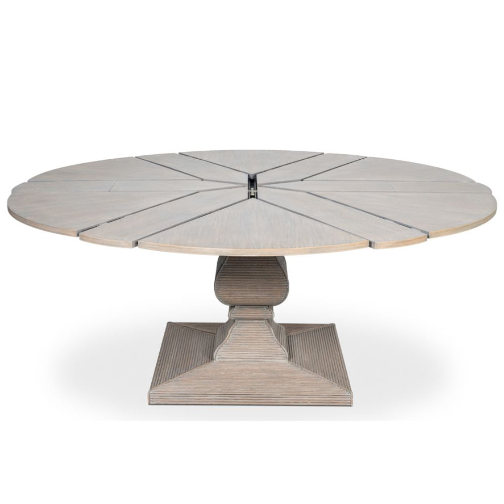 Il tavolo da pranzo estensibile Equestrian Moonskin Jupe presenta un raffinato piano beige con anima in rovere e una base a piedistallo con scanalature in finto legno finemente lavorata che si adatta perfettamente a qualsiasi stile. Il suo sistema di espandibilità in alluminio auto-contenitivo offre un funzionamento fluido e una facile installazione, ideale sia per cene intime che per riunioni più numerose.