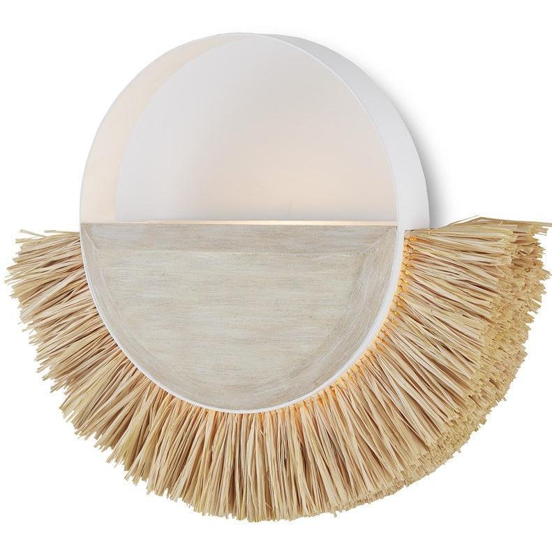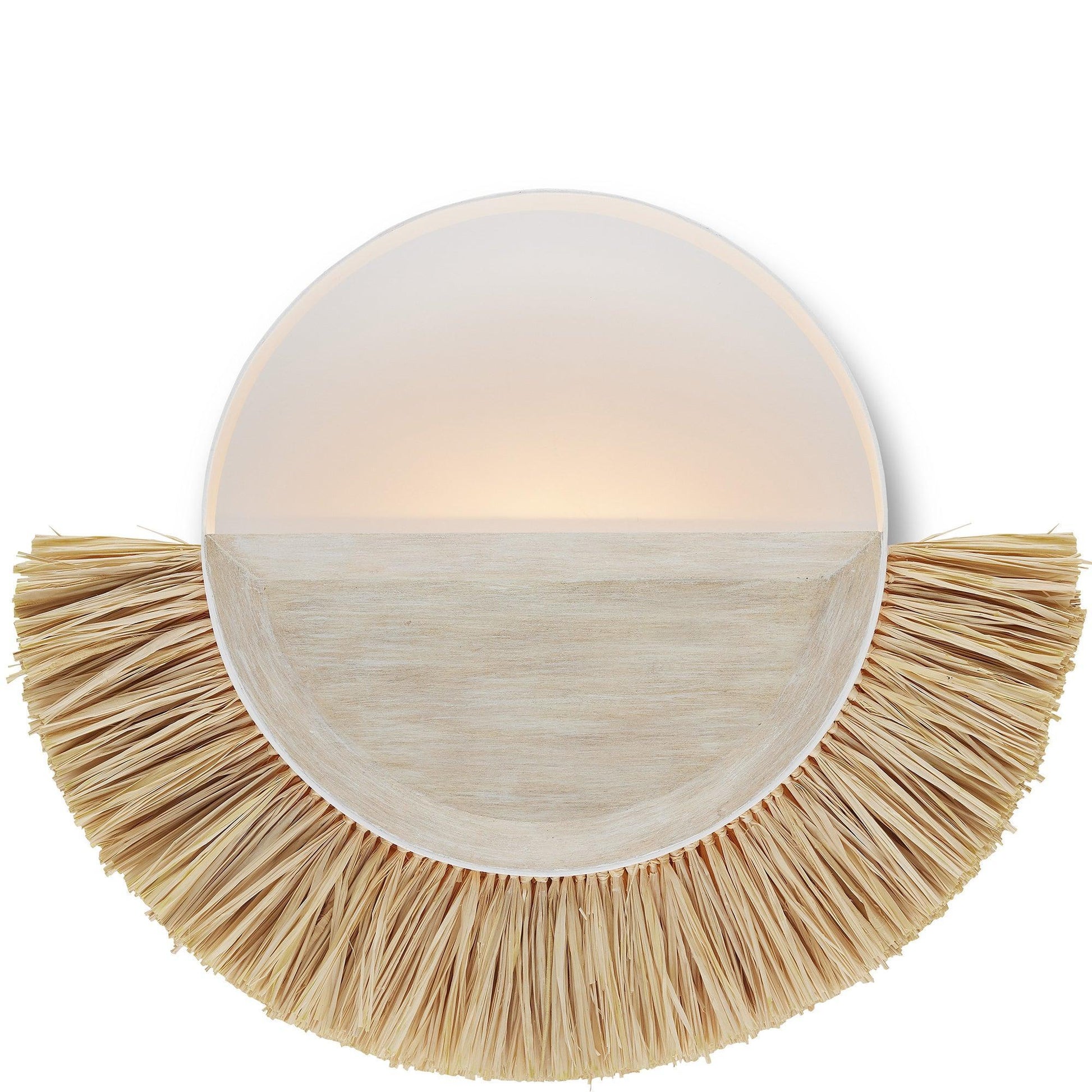 Vivi l'atmosfera della spiaggia con la nostra applique da parete a mezzaluna in rafia. Realizzata in ferro battuto bianco con pannello in legno con finitura arenaria, questa applique diffonde una calda luce attraverso spruzzi di rafia tagliati a mano. Versatile e ispirata al viaggio tra le isole, aggiunge un tocco di eleganza a qualsiasi spazio.