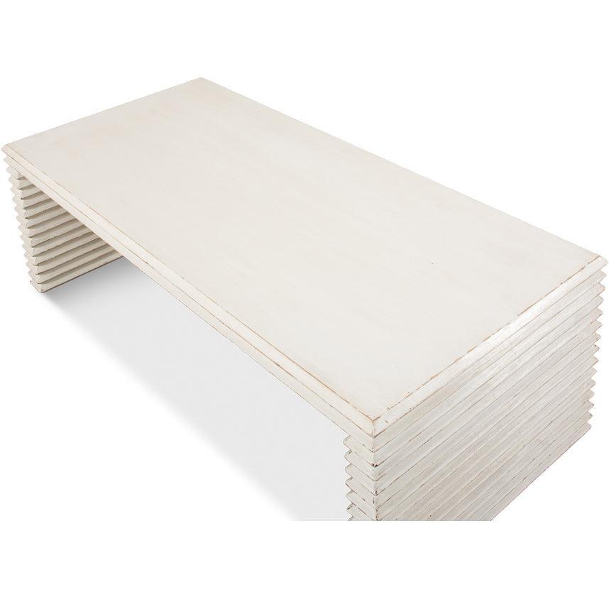 Il tavolino da caffè contemporaneo bianco a coste è realizzato in pino massello con un design a panca. La texture a coste sulla base conferisce a questo pezzo un'energia giocosa, trendy ed elegante. La finitura bianco anticato è calda e accogliente, facile da abbinare a qualsiasi palette di colori. Questo tavolino da caffè contemporaneo e glamour completerà l'arredamento del tuo soggiorno con la sua bellezza e il suo fascino.