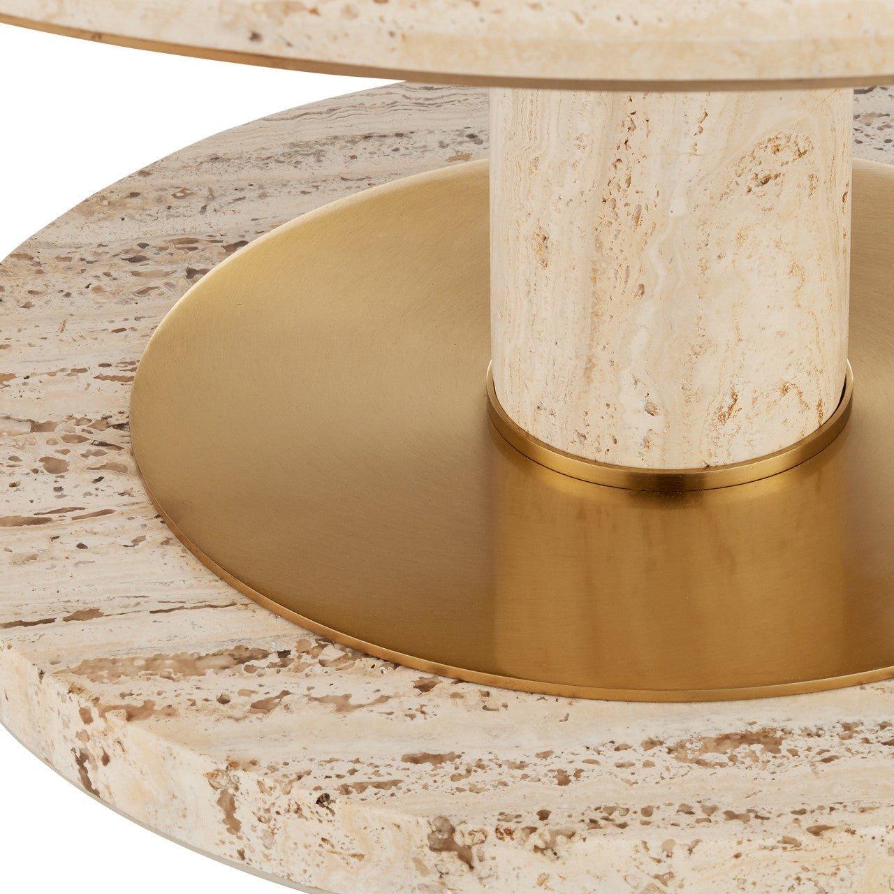 Il tavolino da caffè in travertino naturale emana una personalità dinamica, con un'affascinante combinazione di metallo e pietra. Questo pezzo di design presenta una straordinaria colonna in travertino, sapientemente traforata da un elegante metallo che ne amplifica l'impatto visivo. La lussuosa finitura del metallo esalta perfettamente le venature più scure di questo materiale naturale.