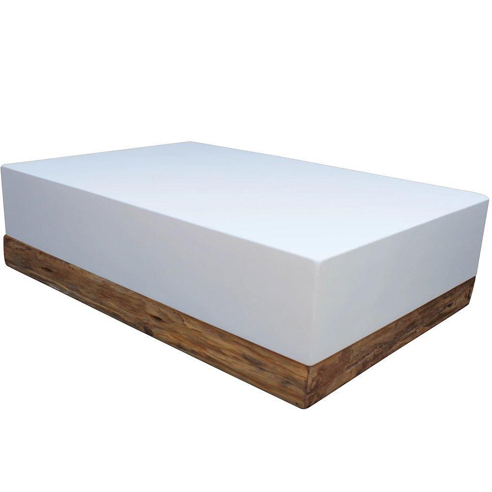 • Tavolino da caffè rettangolare da esterno • Finitura bianca sul piano in resina • Base in legno di teak giavanese recuperato con finitura naturale