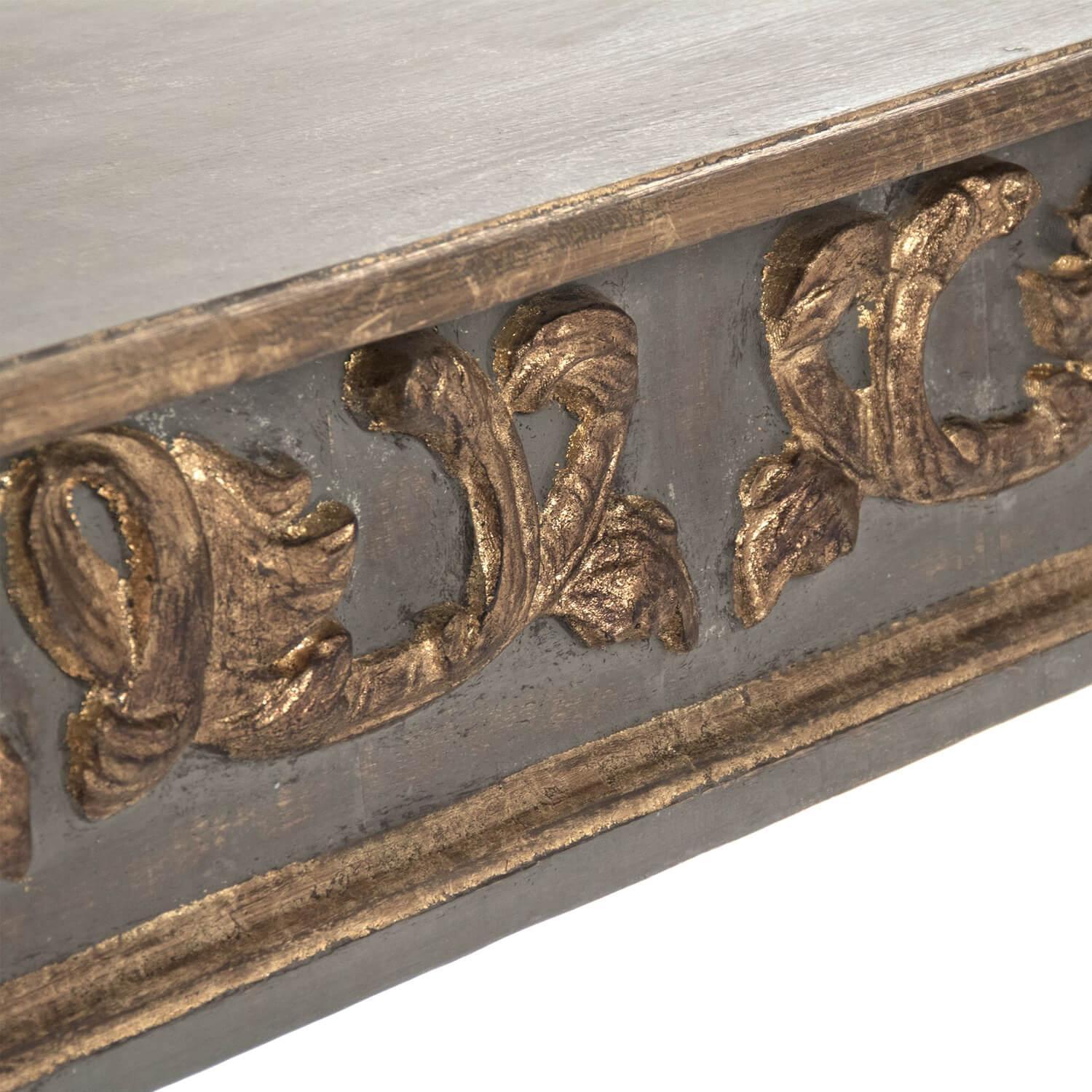 Ricordando un pezzo che si potrebbe trovare nel salotto di Mozart, la consolle Symphonic Ornate Gray è una grande consolle che porterà l'atmosfera della vecchia Europa nella vostra casa. Questa consolle francese presenta intagli decorati dipinti in oro anticato, mentre la base è rifinita in un grigio intenso con una miscela di colori che crea contrasto. Le gambe tornite dorate completano il pezzo.
