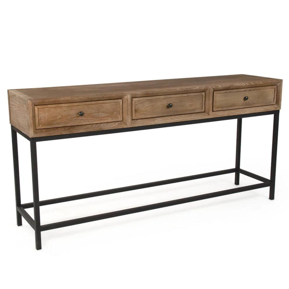 Cerchi un tavolo semplice con un tocco di stile country? Questo è perfetto! Ha un robusto piano in legno e una solida struttura in metallo nero. È caldo e robusto. Inoltre, ha tre cassetti per riporre gli oggetti. Ha un aspetto gradevole e retrò e sarebbe perfetto per l'ingresso, il corridoio o il soggiorno.