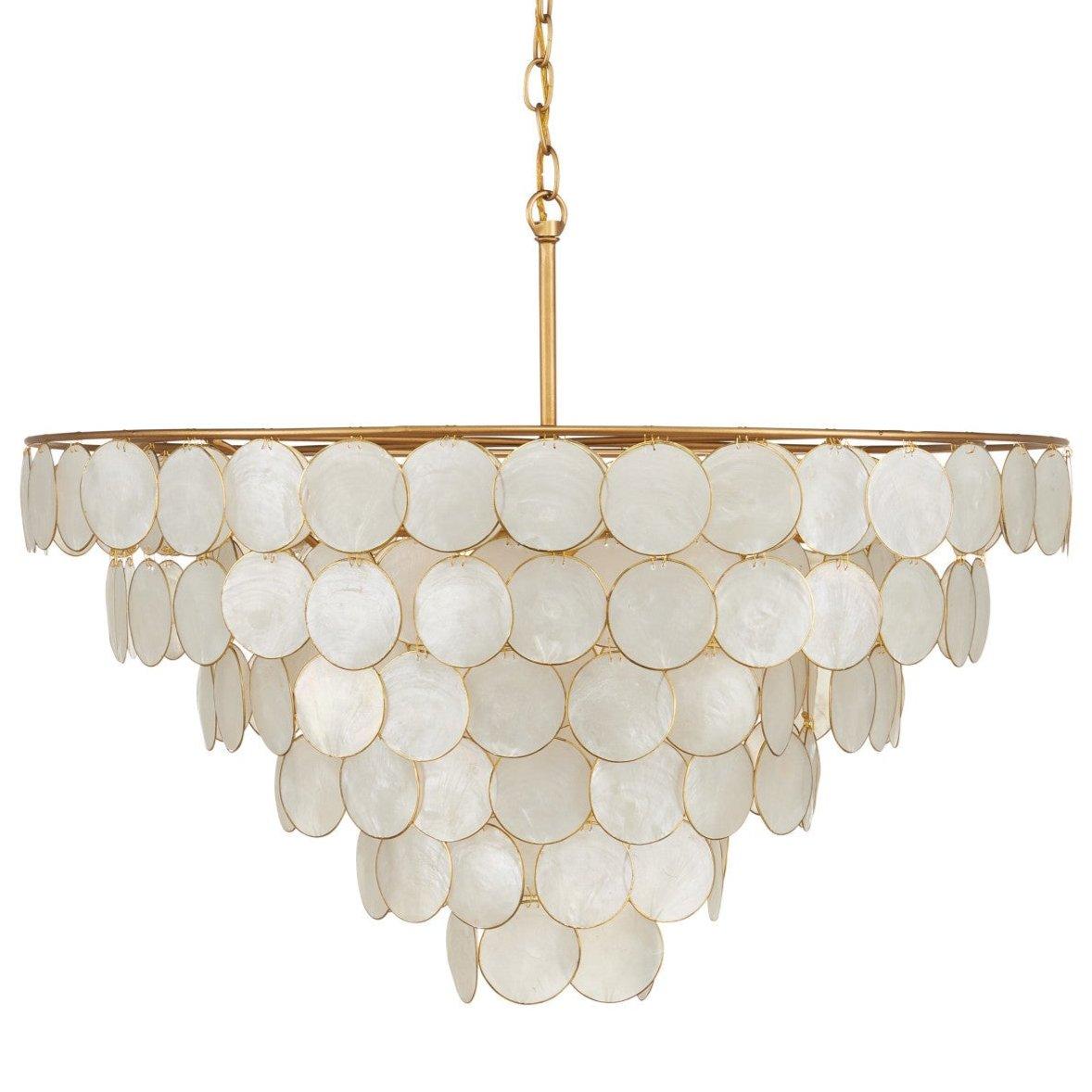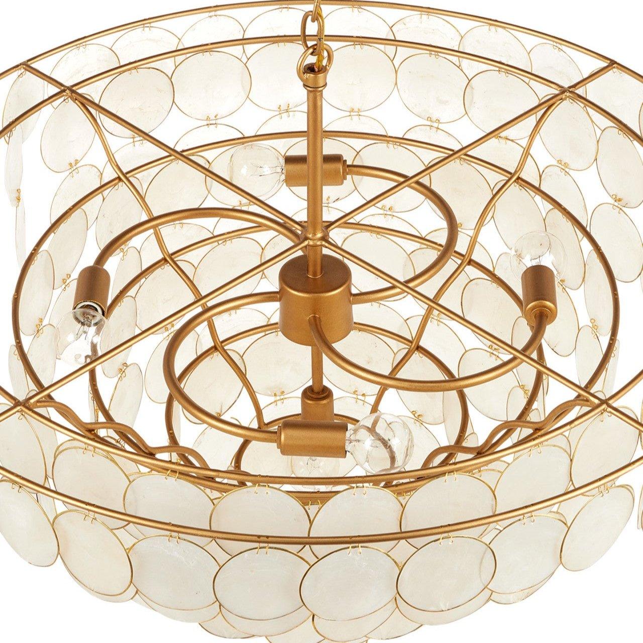 L'atmosfera eterea della lampada Bon Vivant Capiz Shells, progettata da Tom Caldwell, emana lusso. Le conchiglie Capiz, circondate da bordi decorativi in metallo che richiamano la finitura dorata del resto della lampada, irradiano luminosità. Un raffinato elemento di design è evidente nei delicati fili che collegano le conchiglie alla struttura e tra loro. Questa lampada da semi-incasso dorata può facilmente trasformarsi in un lampadario rimuovendo il rosone inferiore.