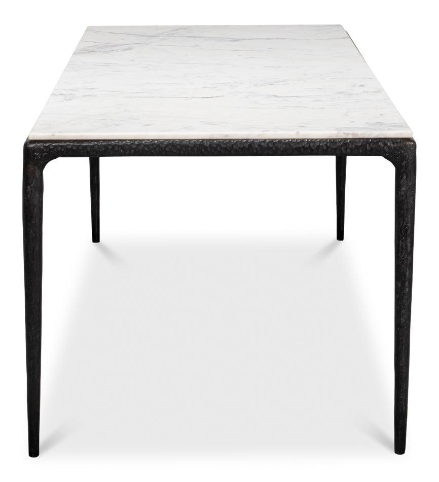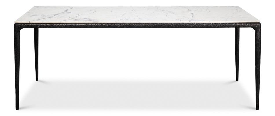 Combinando in modo squisito il ferro forgiato nero e un piano in marmo bianco con delicate venature grigie, il tavolo da pranzo con base in ferro forgiato e piano in marmo offre una combinazione senza tempo di stile sofisticato e lavorazione artigianale di qualità, destinata a essere tramandata di generazione in generazione.