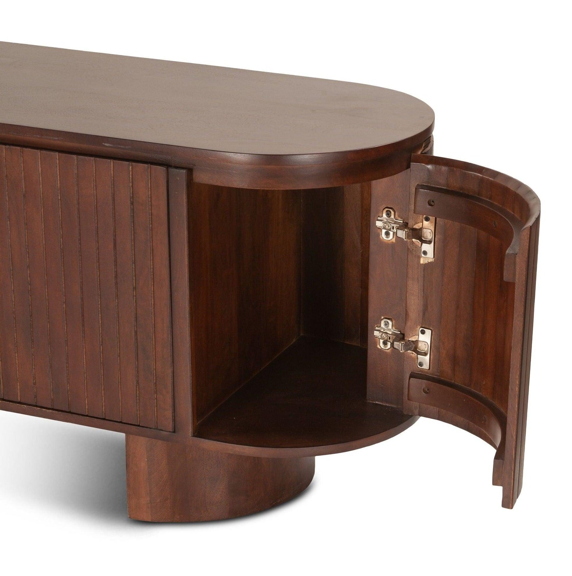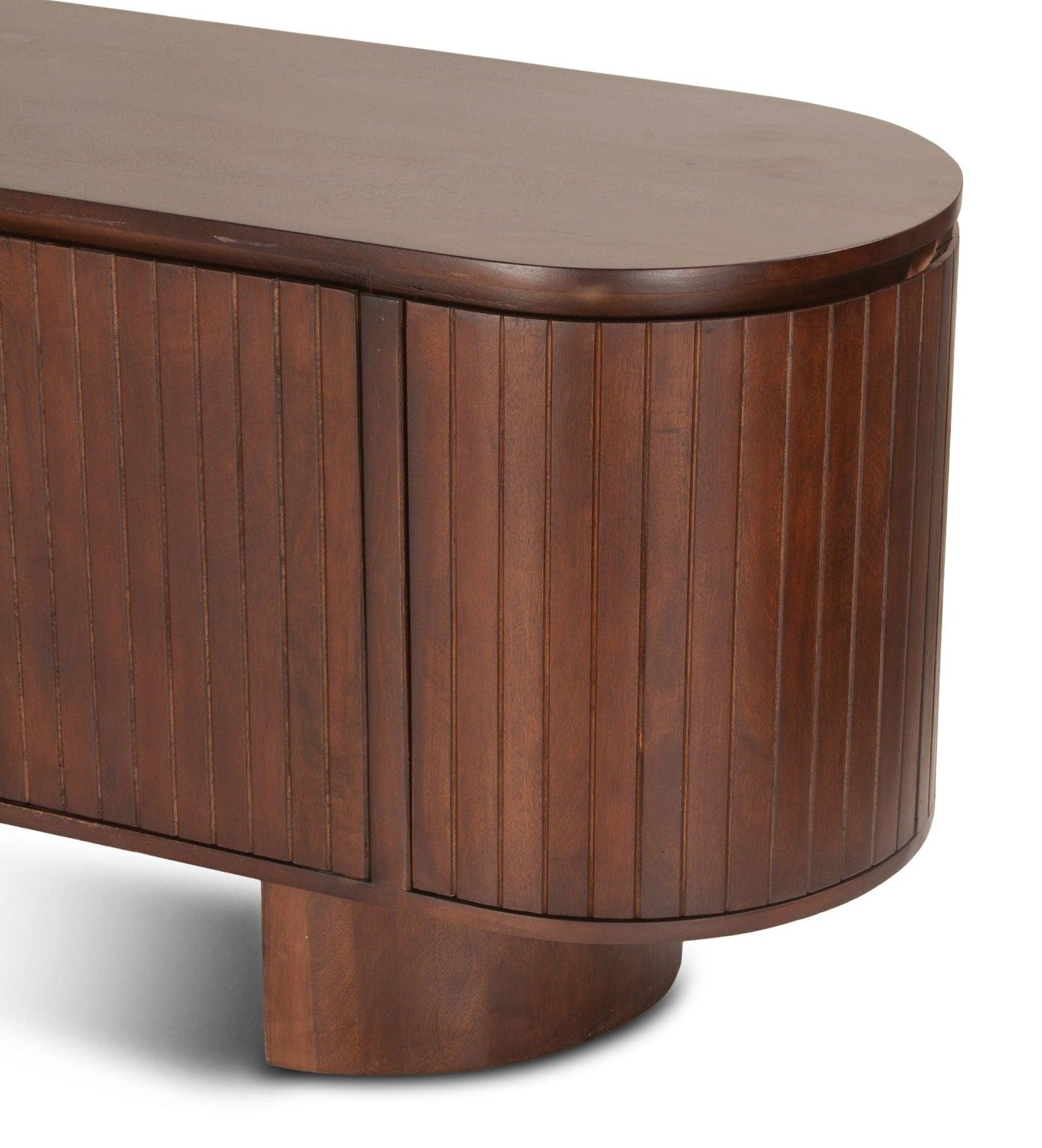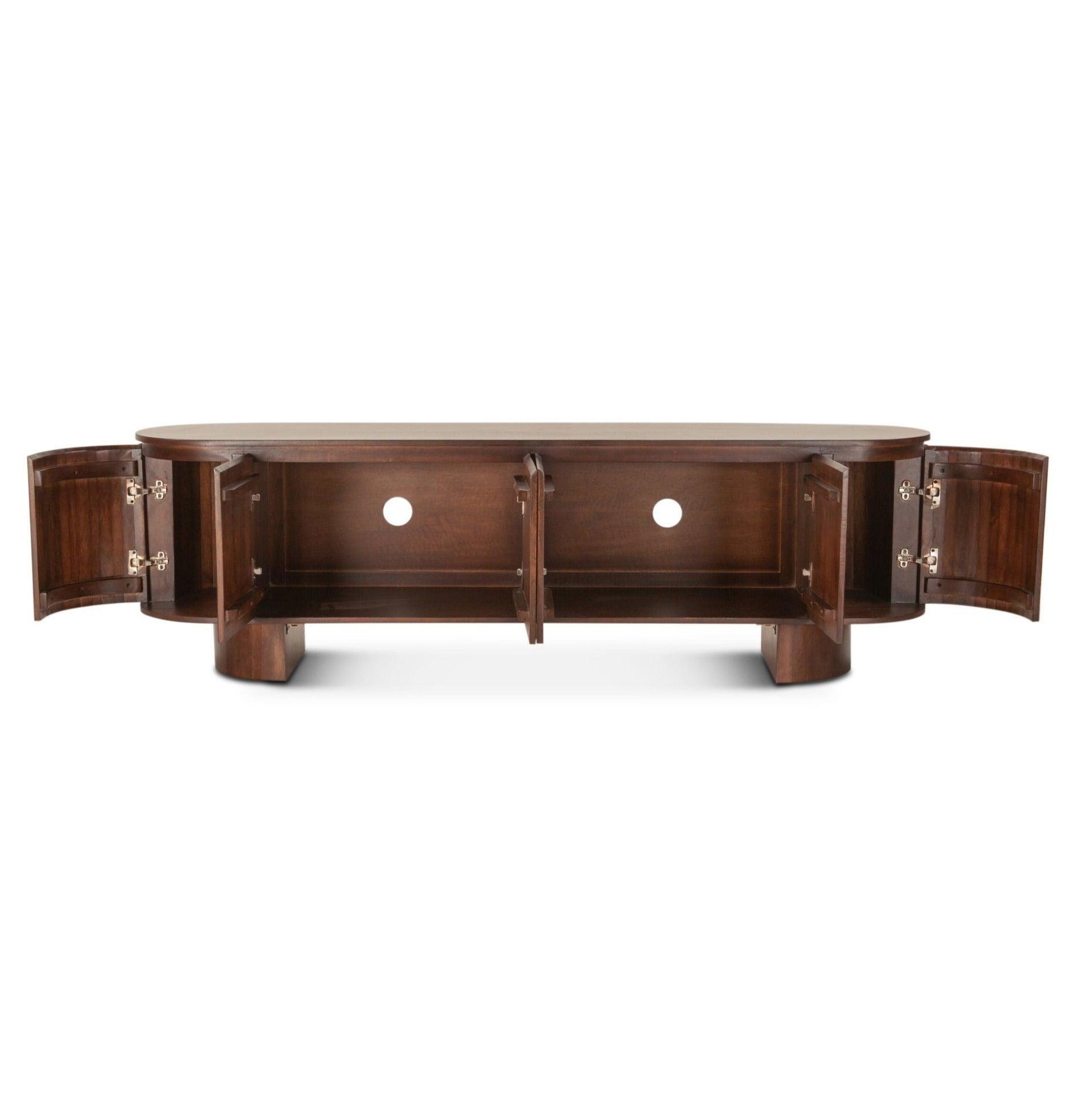 Il mobiletto multimediale moderno in legno di mango è dotato di quattro vani portaoggetti interni con ripiani che conferiscono un tocco unico di eleganza e funzionalità. Il suo design semplice ma sofisticato gli permette di integrarsi perfettamente con qualsiasi stile d'arredo, rendendolo un pezzo versatile che può essere facilmente integrato in qualsiasi ambiente. Realizzato in legno massello di mango, questo mobiletto multimediale presenta una splendida venatura naturale e la sua ricca finitura in mogano invecchiato completa il design generale.