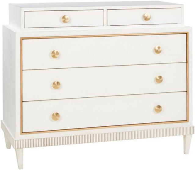 La cassettiera Contempo Glamour è un pezzo unico per la tua camera da letto. Due cassetti sono rastremati sopra i tre grandi cassetti inferiori, creando un design a più livelli. Le finiture in ottone e i bordi dorati contrastano perfettamente con la finitura bianco conchiglia. Il motivo a frange intagliato a mano lungo i bordi inferiori aggiunge ancora più carattere a questa cassettiera glamour contemporanea.
