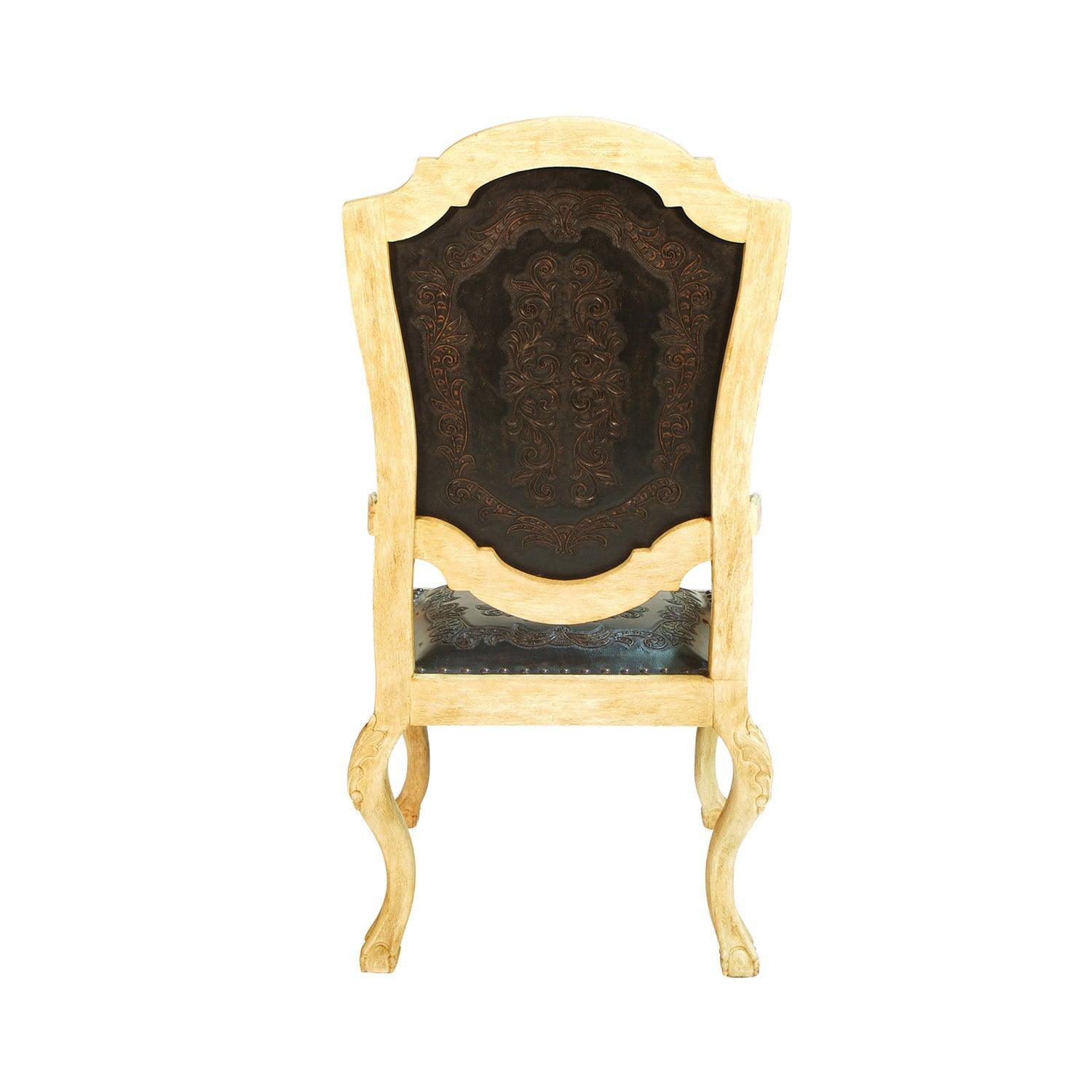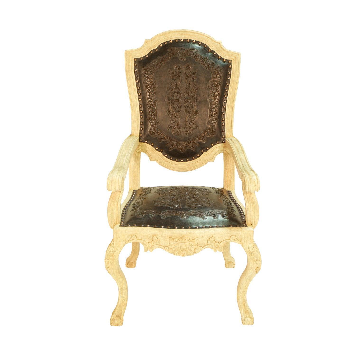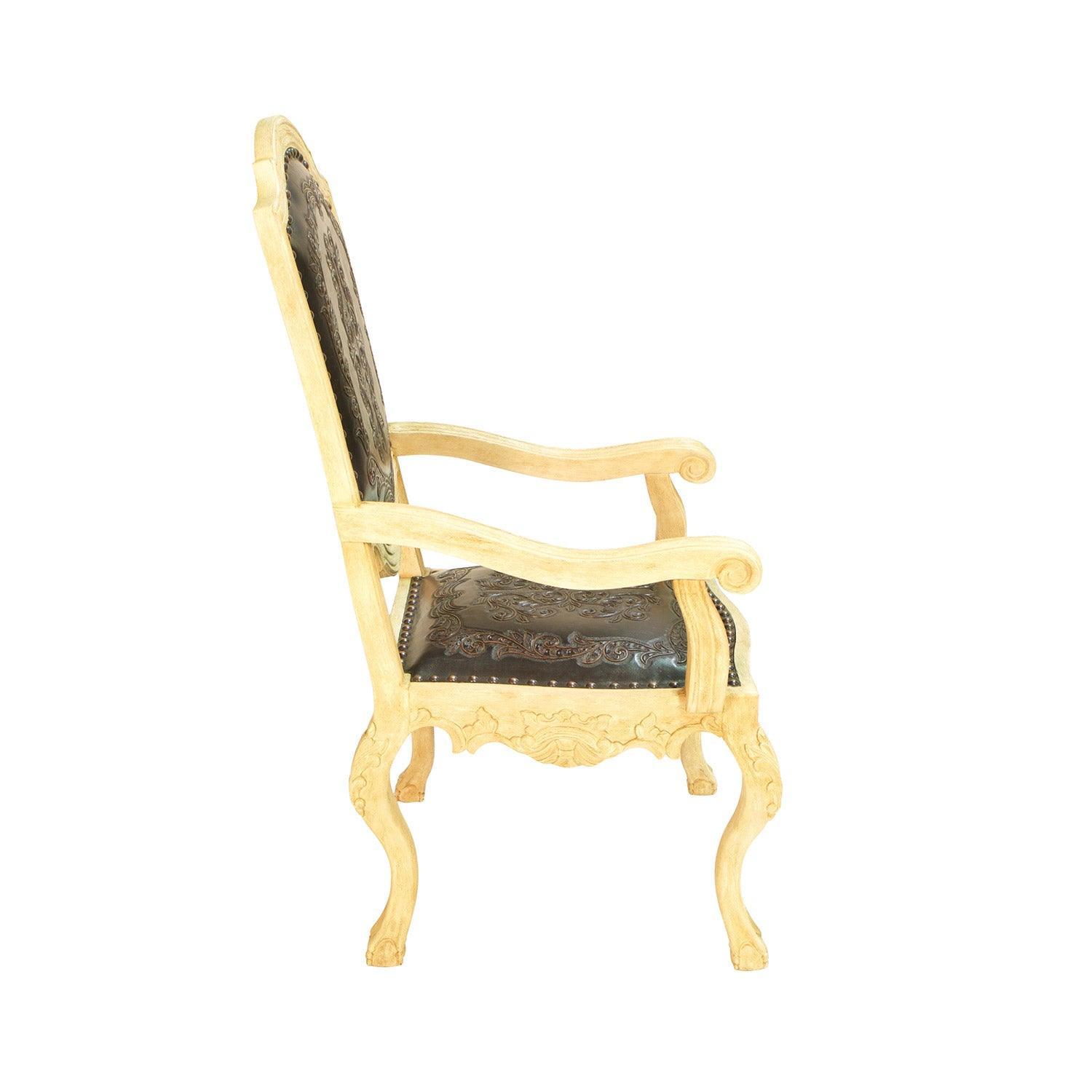 La sedia da pranzo Provincial in pelle lavorata trasuda eleganza con il suo aspetto distintivo. La struttura in legno intagliato presenta braccioli curvi e motivi a volute rifiniti a mano per un tocco di stile in più. Una finitura naturale esalta questi dettagli, mentre il rivestimento in pelle lavorata nera offre il contrasto perfetto. Dettagli in metallo borchiato rivestono i bordi per rendere questa sedia da pranzo ancora più abbagliante.