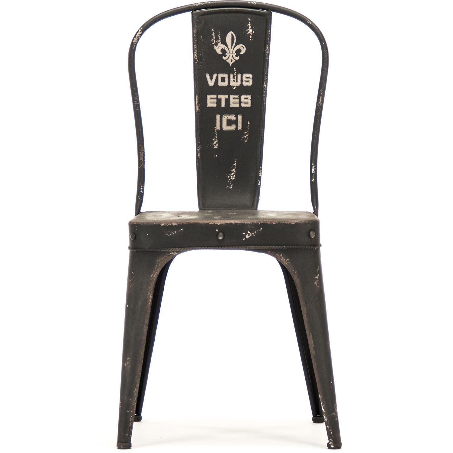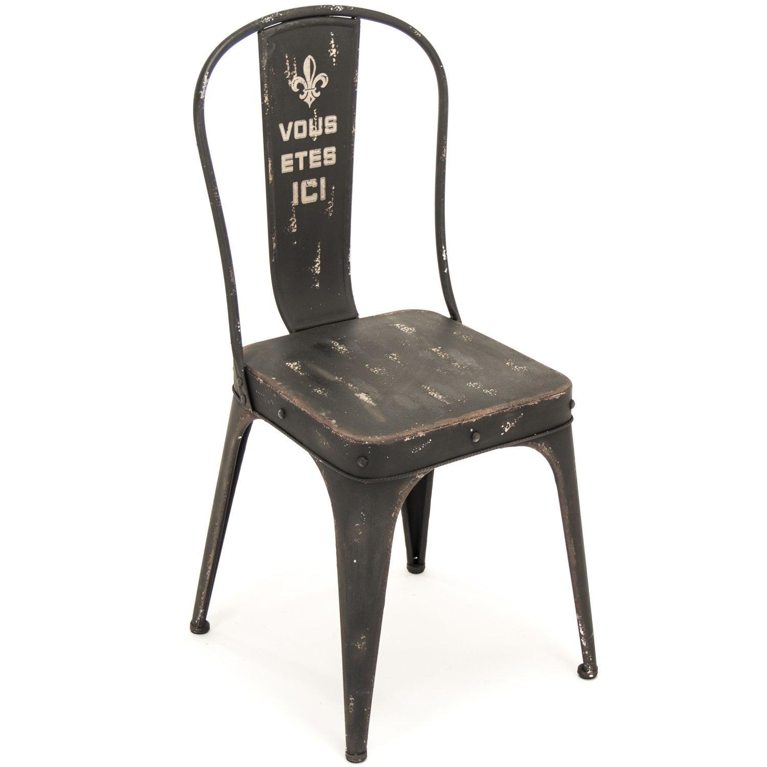 La scritta "Vous Etes Ici" è incisa sul retro di questa sedia in metallo nero, sotto il simbolo del giglio. Questa sedia è realizzata in metallo con una finitura nera arrugginita, che la rende simile al ferro vero. Questa adorabile e chic sedia è perfetta come sedia da pranzo o come seduta aggiuntiva. Set da 2.
