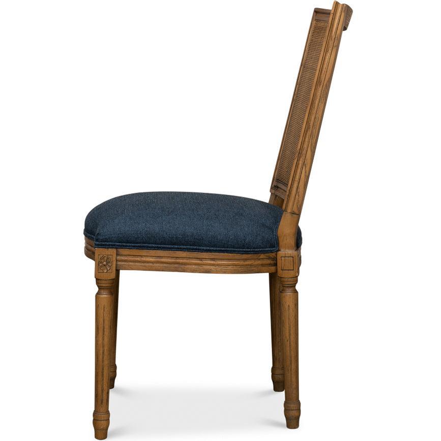 La sedia da pranzo in stile country francese con motivo in canna è ricca di eleganza e carattere. La struttura in legno massello presenta dettagli intagliati a mano e gambe scanalate per un look di classe. La finitura in frassino contrasta con il rivestimento in tessuto blu, creando un design lussuoso. Lo schienale squadrato presenta un dettaglio in canna che rende questa sedia da pranzo in stile country francese ancora più esclusiva.