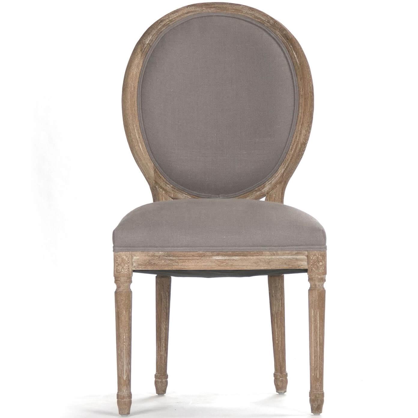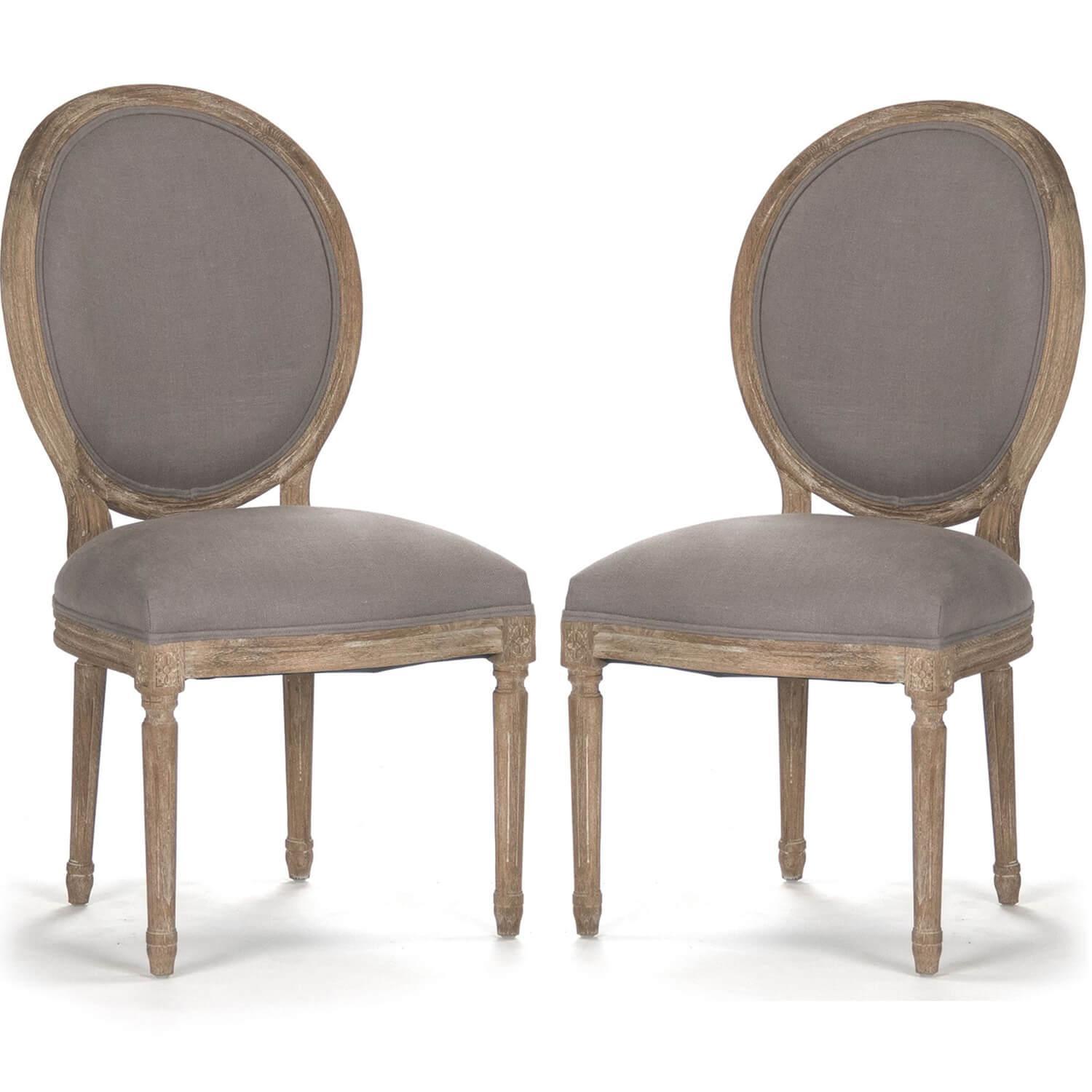 • Set di due sedie da pranzo in stile country francese • Rivestito in lino grigio neutro • Cornici intagliate in rovere grigio sbiancato