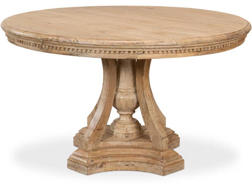 Il tavolo da pranzo Chantal French Pedestal è un esclusivo tavolo da pranzo rotondo con una splendida base a piedistallo chiusa e intagli che circondano il piano spesso. Realizzato in legno massello di mango, questo tavolo rotondo in stile country francese emana calore grazie alla finitura color terra di Siena, marrone chiaro dorato. Con i suoi 16,7 m di larghezza, questo tavolo può ospitare comodamente sei persone.