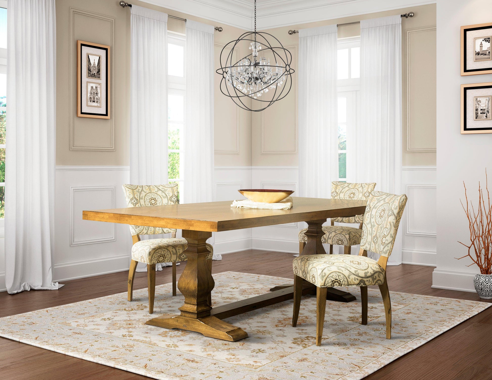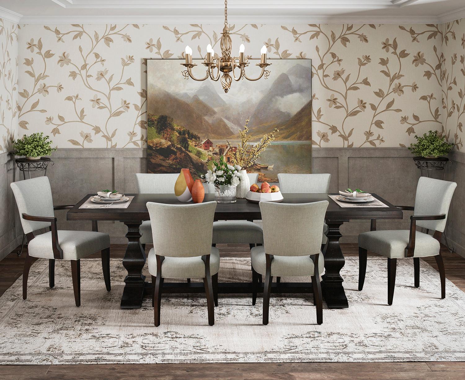 Gusta ogni pasto con stile con questo classico ma lussuoso tavolo da pranzo con piedistallo in stile country francese. Sapientemente realizzato con un piano in acero massello, vanta elementi di design tradizionali impreziositi da materiali di alta qualità. Questa aggiunta unica nel suo genere trasformerà la tua sala da pranzo in un rifugio sofisticato.