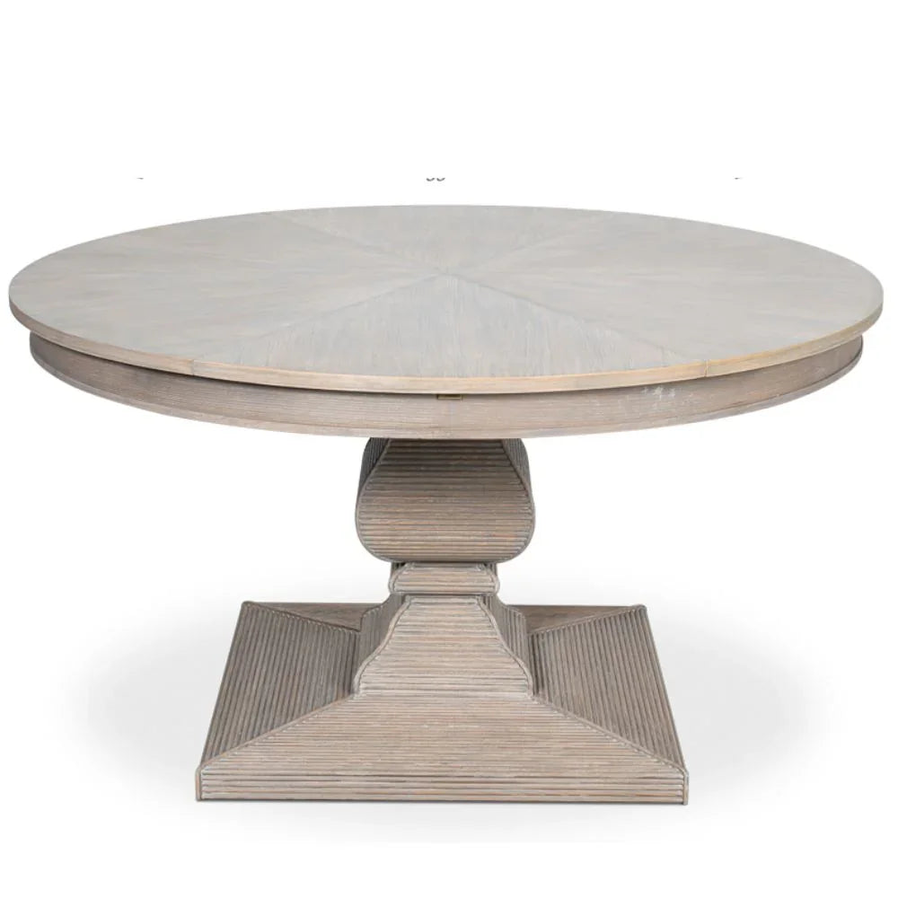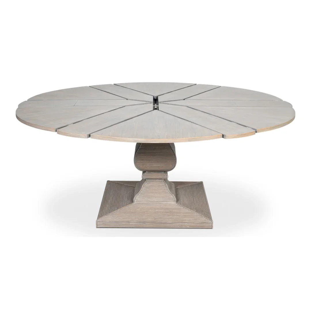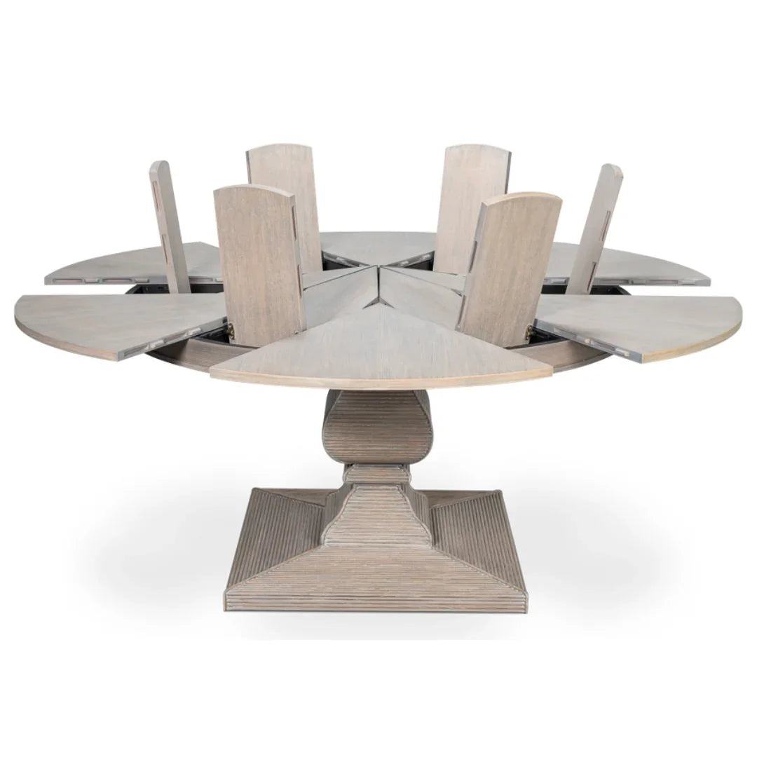 Il tavolo estensibile Equestrian Moonskin Jupe fonde perfettamente uno stile senza tempo con funzionalità moderne, con piano in frassino, anima in rovere e una base a piedistallo con finitura in finto legno, finemente lavorata e adatta a qualsiasi arredamento. Il suo sistema di estensibilità in alluminio auto-contenitivo offre un funzionamento fluido e un facile montaggio, perfetto per riunioni grandi o piccole. Legno massello, finitura Moonskin. Peso: Medio (127 kg) | Grande (145 kg).