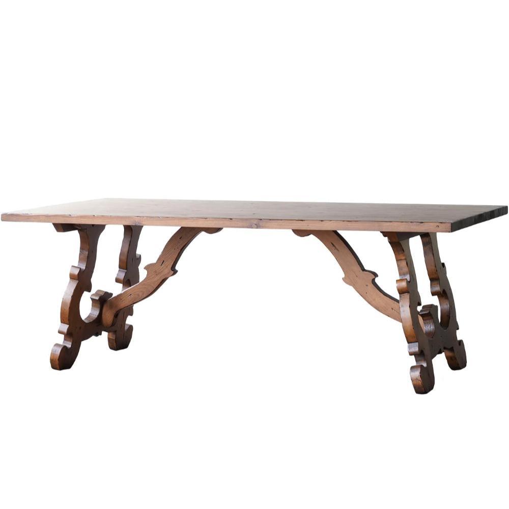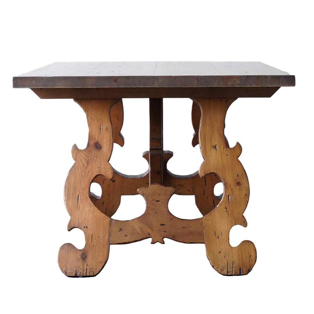 Il tavolo da pranzo con cavalletto a volute francesi emana un'eleganza senza tempo con gambe in legno finemente intagliate, supporti a forma di arpa e una traversa elegantemente arcuata. Rifinito in un marrone anticato invecchiato, può ospitare comodamente da sei a otto persone, aggiungendo un tocco di raffinatezza classica e una bellezza ispirata alla tradizione a qualsiasi sala da pranzo.