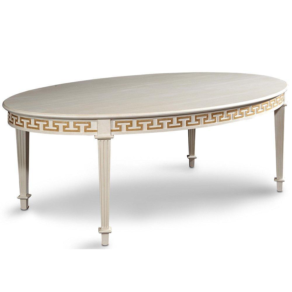 Un'aggiunta squisita alla vostra casa, il tavolo da pranzo ovale con bordo a greca offre una rivisitazione moderna di un classico senza tempo. Splendidamente sagomato, con un profilo ovale allungato, è rifinito in un bianco candido e pulito, con scintillanti accenti in oro anticato. Intagliato a mano e realizzato su ordinazione, questo pezzo è davvero invidiabile.