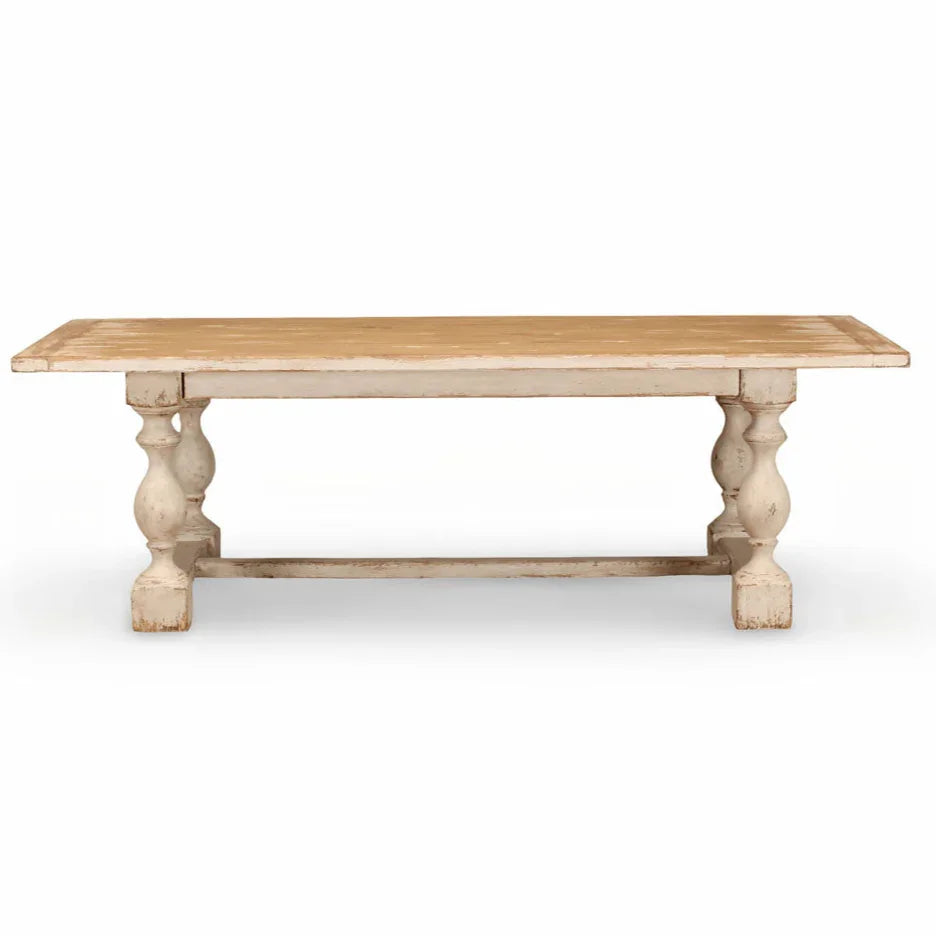 Realizzato con cura artigianale, il tavolo da pranzo rustico bianco con cavalletto in stile fattoria presenta una finitura bianco anticato, un piano in legno anticato naturale ed eleganti gambe a balaustra. Il suo aspetto invitante e il versatile design rettangolare si adattano a spazi costieri, cottage e case coloniche moderne, rendendolo perfetto per riunioni e cene intime.
