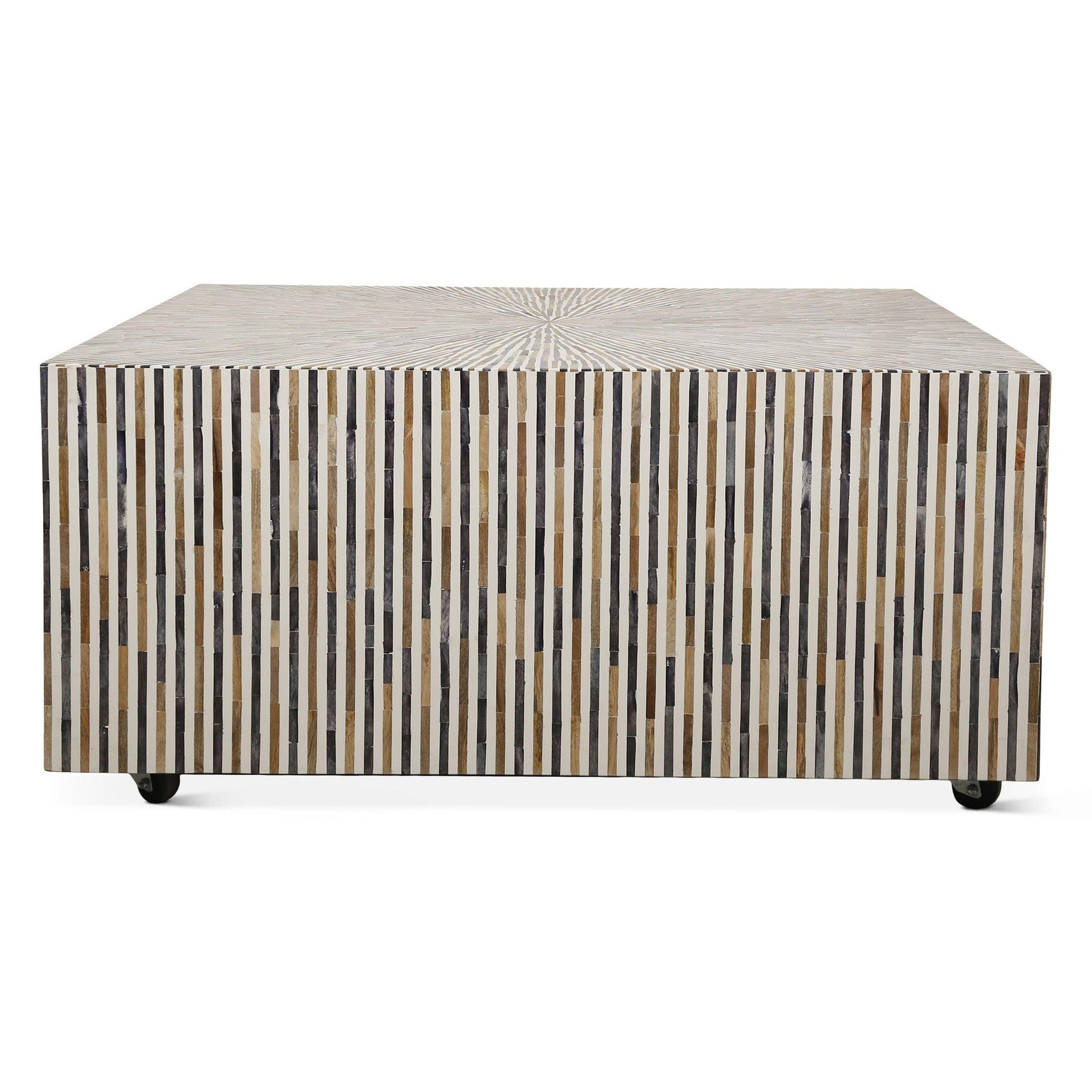 Aggiungi un tocco artistico al tuo soggiorno con il tavolino Serengeti Horn Inlay. Realizzato in legno di mango naturale con intricati intarsi in corno che creano un sofisticato motivo a strisce. Una resistente base in metallo offre una moderna stabilità, mentre le calde tonalità del legno e del corno donano un tocco ricco e naturale. Perfetto per interni contemporanei ed eleganti, come punto focale funzionale e accattivante.