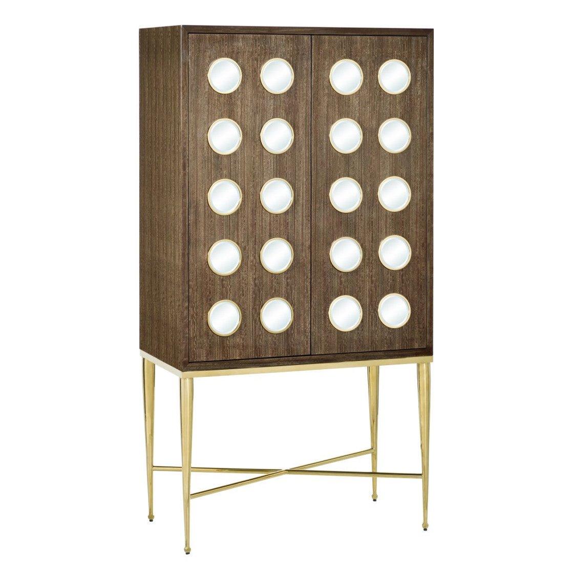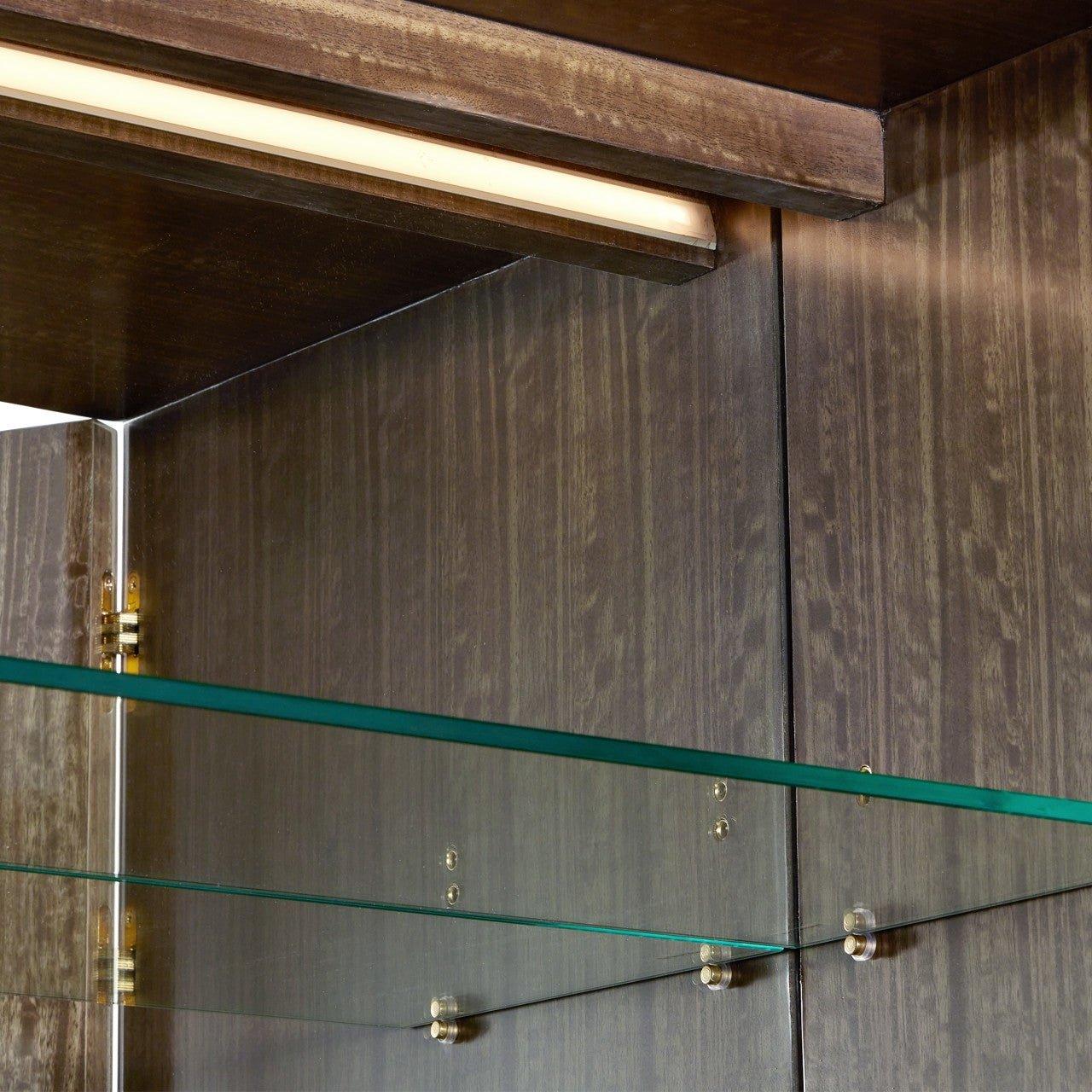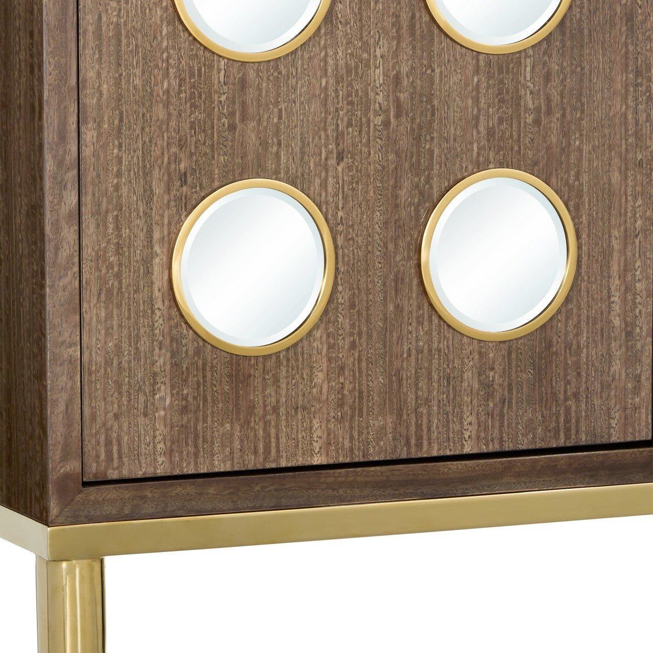La credenza a due ante Tawny Brown emana opulenza ed esclusività grazie alla sua pregiata struttura in legno di pioppo e alle lussuose impiallacciature in eucalipto. La texture lineare del legno è splendidamente accentuata dalla finitura marrone fulvo, mentre l'esterno lucido emana raffinatezza. All'interno, uno schienale a specchio, due ripiani in vetro, una lastra in marmo e un piano estraibile offrono caratteristiche pratiche ma lussuose, mentre gli specchi bisellati e gli inserti in acciaio inossidabile aggiungono un tocco di fascino artistico. Le gambe e le traverse in ottone lucido completano l'aspetto raffinato e raffinato di questa credenza di alta gamma.