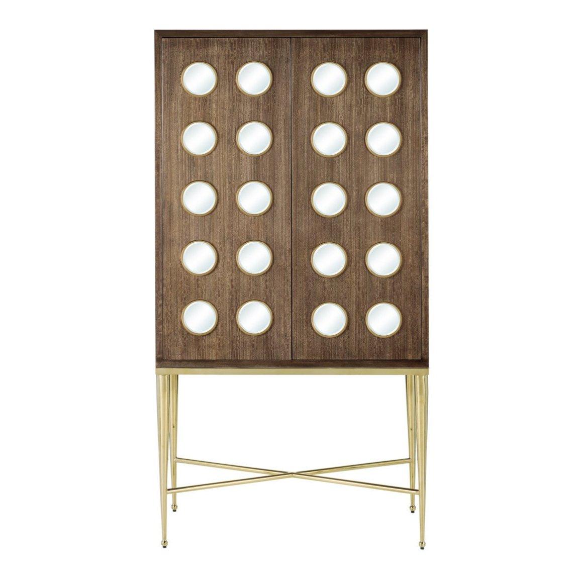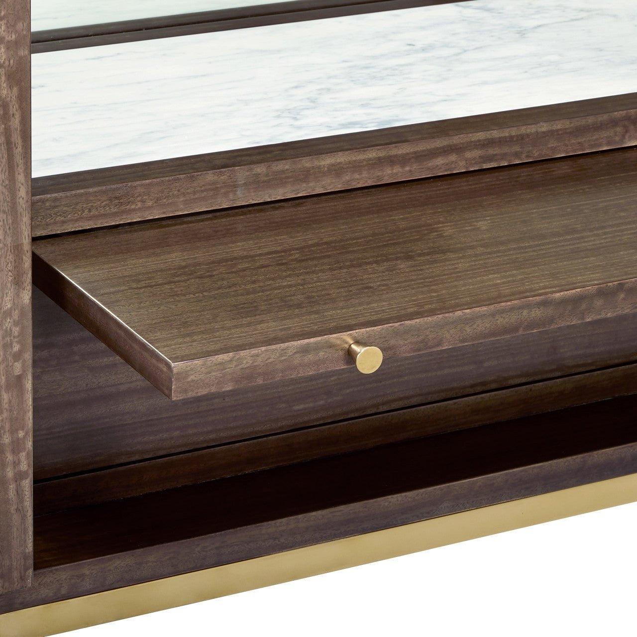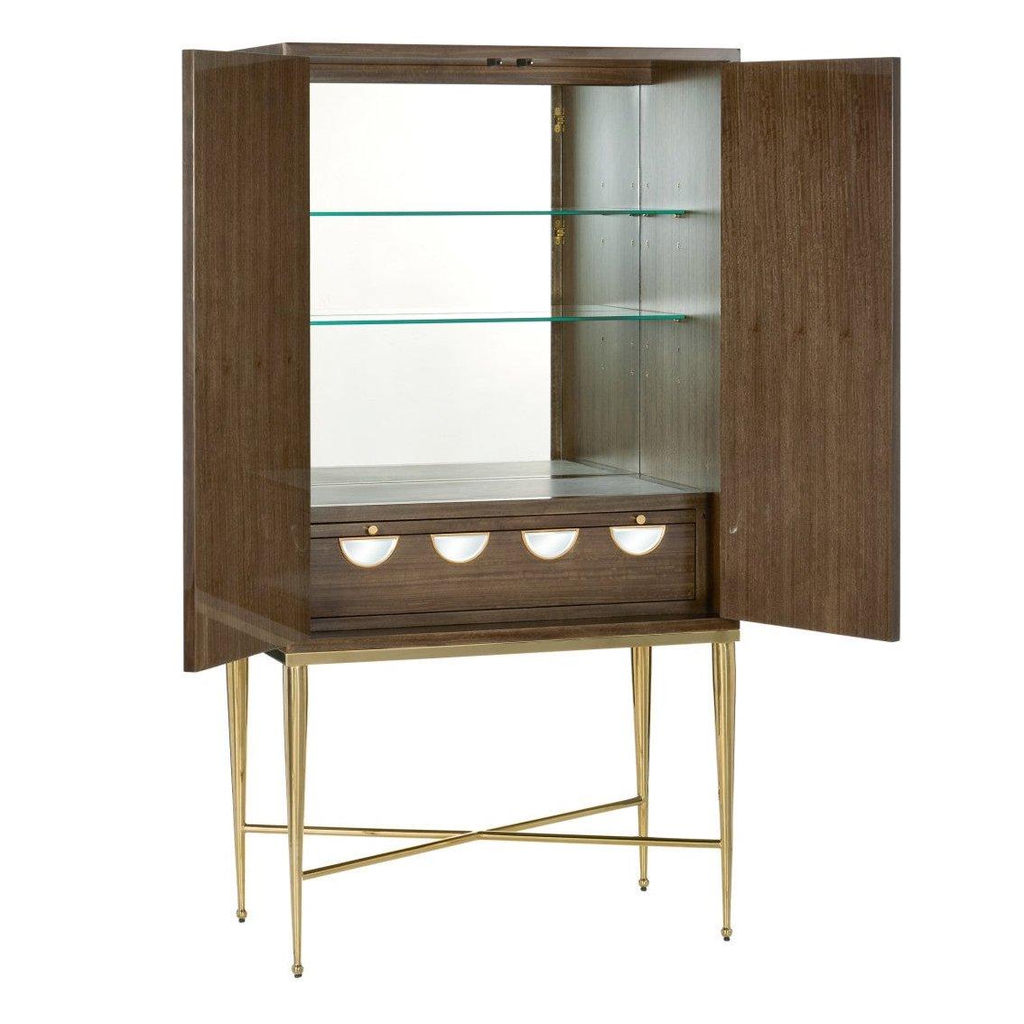 La credenza a due ante Tawny Brown emana opulenza ed esclusività grazie alla sua pregiata struttura in legno di pioppo e alle lussuose impiallacciature in eucalipto. La texture lineare del legno è splendidamente accentuata dalla finitura marrone fulvo, mentre l'esterno lucido emana raffinatezza. All'interno, uno schienale a specchio, due ripiani in vetro, una lastra in marmo e un piano estraibile offrono caratteristiche pratiche ma lussuose, mentre gli specchi bisellati e gli inserti in acciaio inossidabile aggiungono un tocco di fascino artistico. Le gambe e le traverse in ottone lucido completano l'aspetto raffinato e raffinato di questa credenza di alta gamma.
