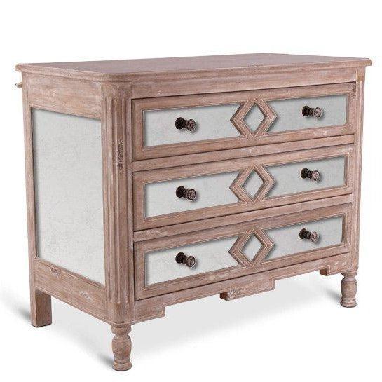 Un esclusivo motivo a rombi si staglia contro i pannelli a specchio anticato sui frontali dei tre cassetti di questo comodino. Pannelli a specchio anticato coordinati sono applicati anche ai lati del comodino. Splendide maniglie dei cassetti e interessanti dettagli intagliati completano il look.