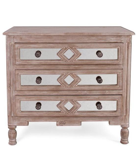 • Pannelli a specchio anticati • Dettagli intagliati a mano • Tre cassetti