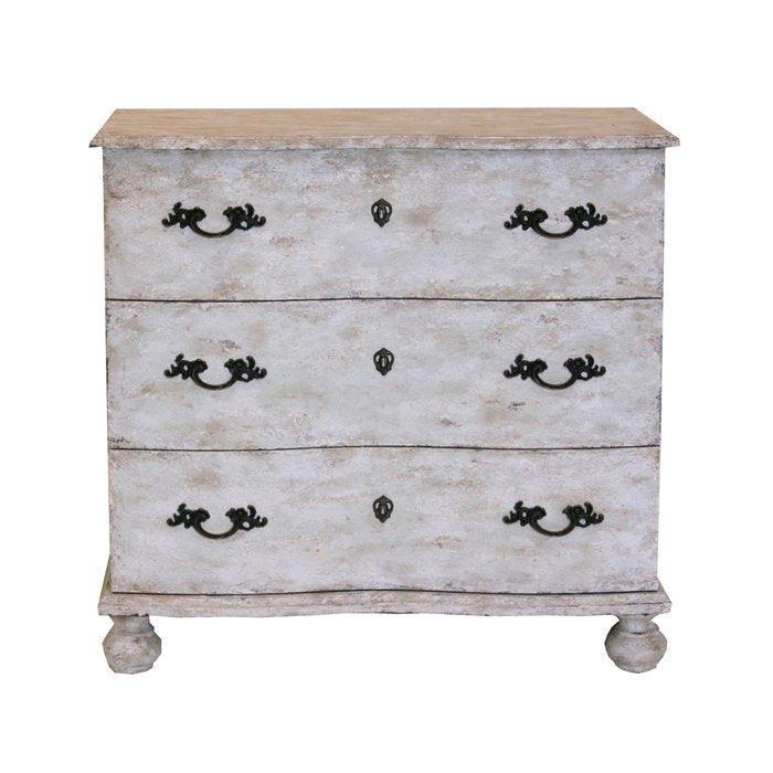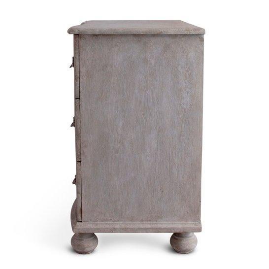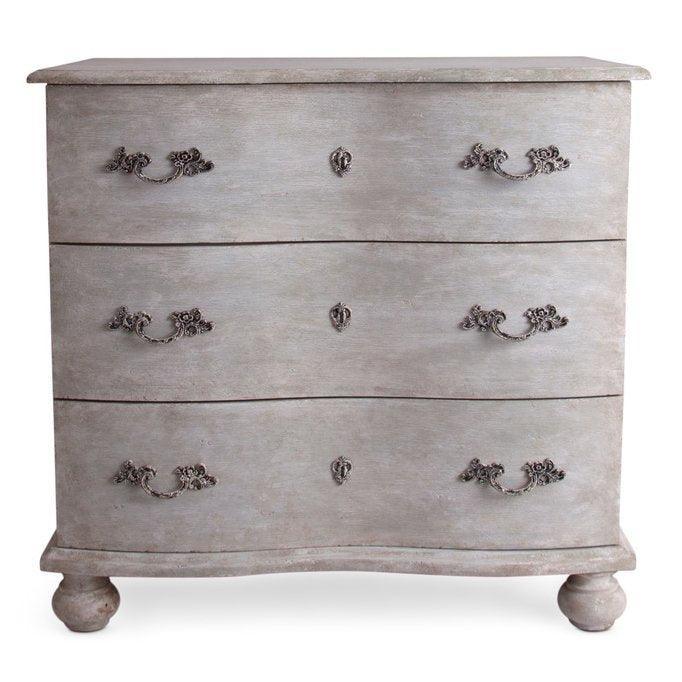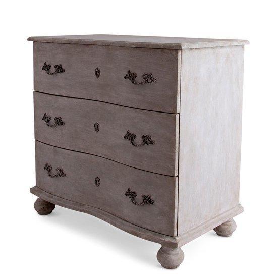 Semplice e graziosa, questa cassettiera a tre cassetti in stile anticato, nei toni del blu e del crema, presenta ferramenta e serrature in metallo nero che creano un contrasto con la finitura chiara. I piedini a panino intagliati e la modanatura alla base ne esaltano il look. Perfetta come comodino o come cassettiera portaoggetti aggiuntiva.
