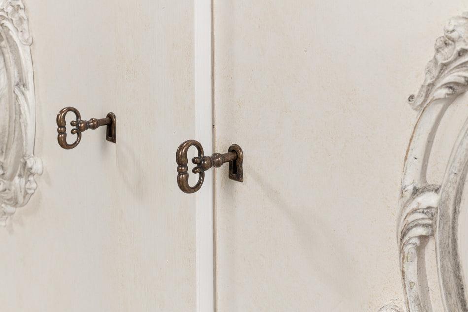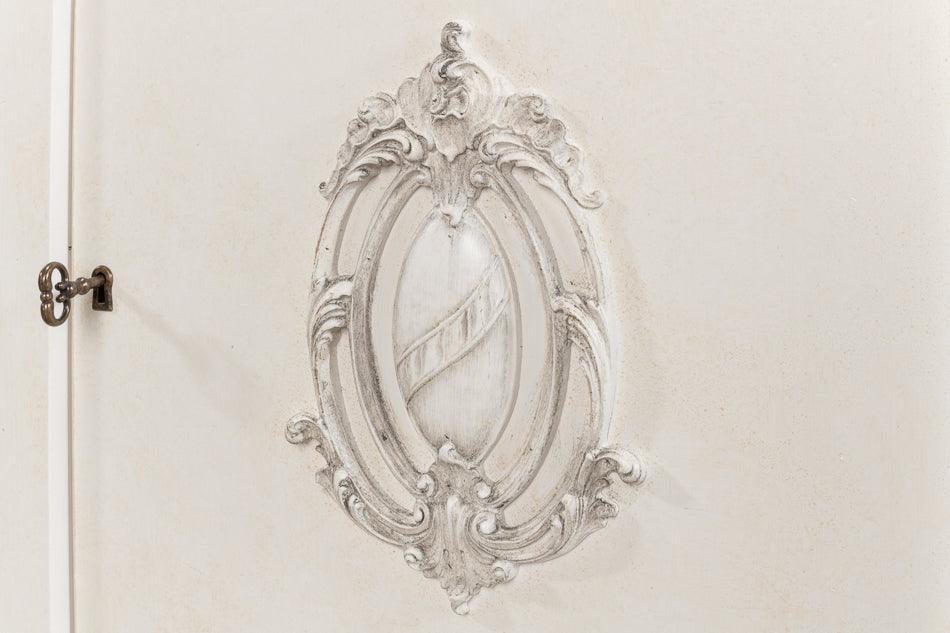 La credenza vintage europea con stemma è un pezzo straordinario che evoca l'atmosfera del vecchio mondo. Questo robusto mobile è dotato di quattro ante che si aprono rivelando un ripiano con scomparti superiori e inferiori. Gli stemmi artisticamente intagliati sulle ante rendono questa credenza unica. Include chiavi anticate per l'apertura delle ante.
