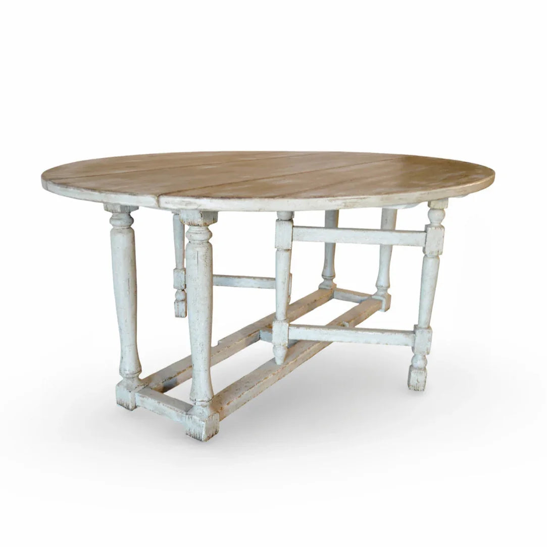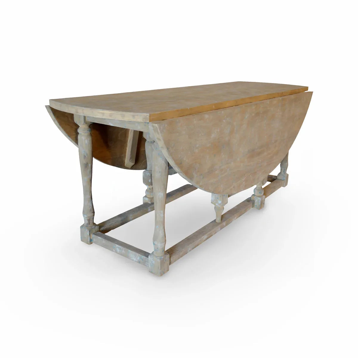 Aggiungi calore e fascino alla tua sala da pranzo con questo tavolo da pranzo ovale rustico con ribalte. Realizzato a mano in legno massello con finitura sbiancata, presenta gambe tornite, rinforzi trasversali e un design salvaspazio con ribalte, perfetto per pasti intimi o grandi riunioni.