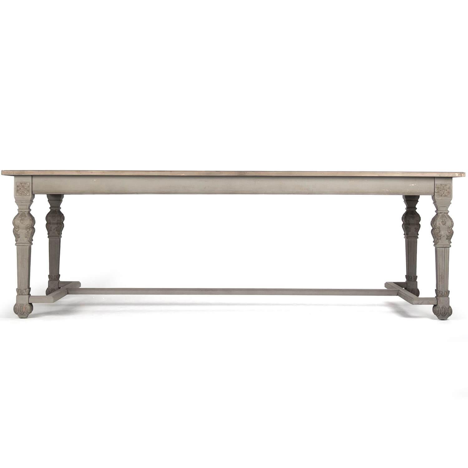 Il tavolo da pranzo bianco anticato con piano in legno francese è un raffinato pezzo intagliato a mano, caratterizzato da un piano in legno rustico, gambe riccamente intagliate e una graziosa traversa in legno. Il piano in legno massello di betulla con finitura a contrasto offre ampio spazio per grandi riunioni di lavoro o pranzi in famiglia.