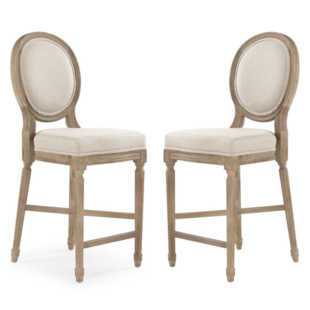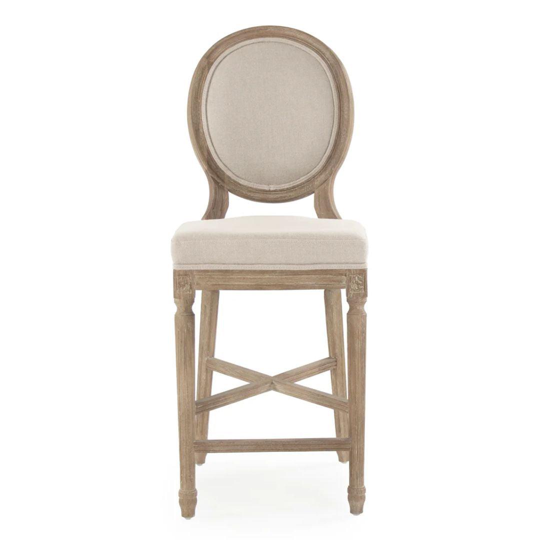Un semplice e naturale tessuto di lino ricopre lo schienale imbottito e la seduta spessa e morbida di questo sgabello da bar. Le gambe a fuso intagliate a mano e i piccoli dettagli floreali sono perfetti per una cucina francese tradizionale. Il legno di rovere è rifinito in grigio sbiancato, un intenso marrone chiaro con una leggera sfumatura grigia e un tocco di sbiancatura.