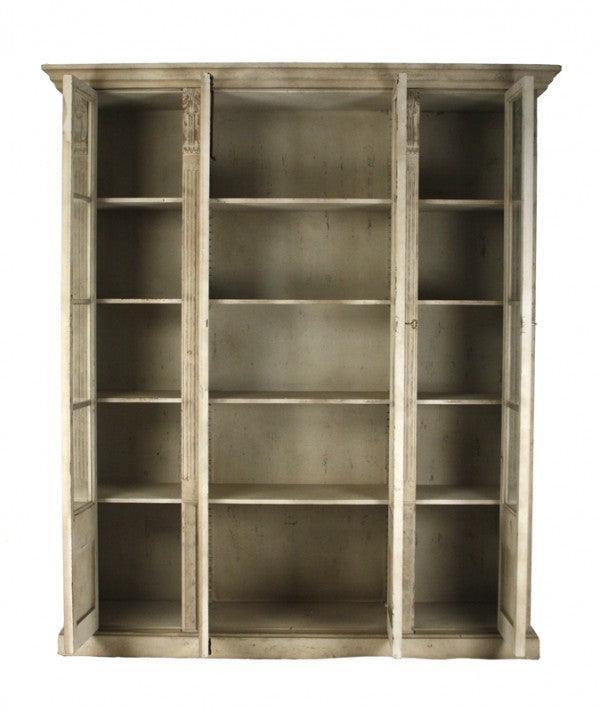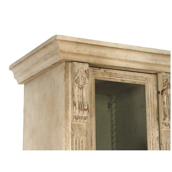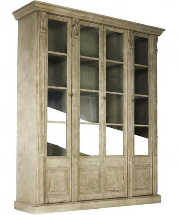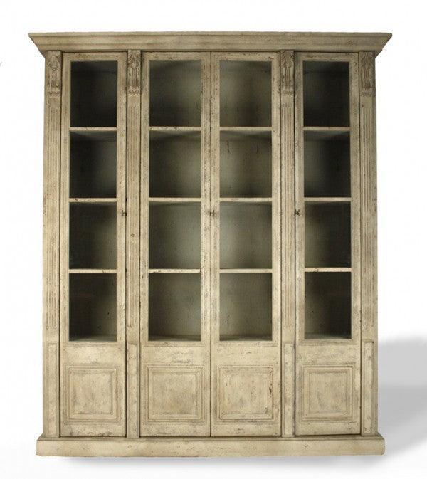 Questo maestoso mobile è realizzato in legno massello con ante in vetro e intricati dettagli di intaglio e modanature. Quattro ante in vetro si aprono rivelando ampi ripiani. Utilizzate questo mobile in una biblioteca domestica per esporre edizioni pregiate o posizionatelo in un ampio bagno padronale per riporre biancheria e altri articoli da bagno.