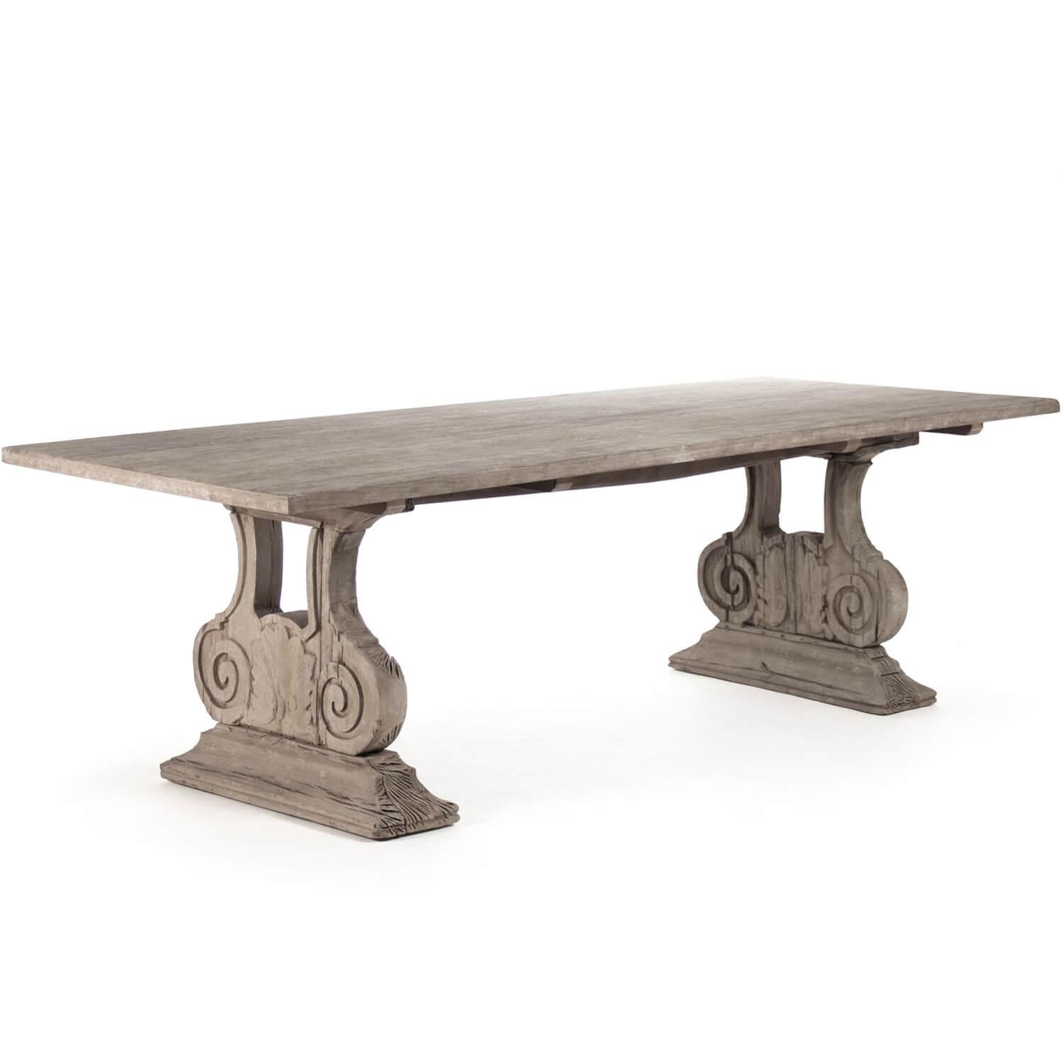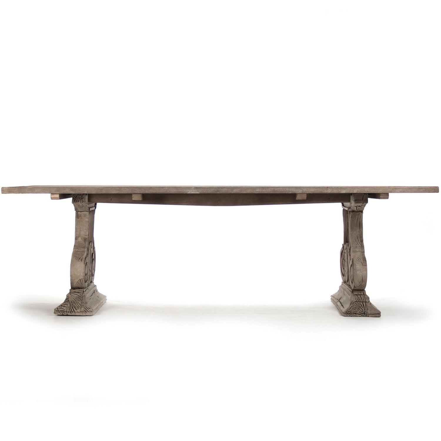 Questo tavolo generoso è perfetto per le riunioni di famiglia. I piedistalli intagliati a mano sostengono l'imponente piano di questo tavolo da pranzo a doppio piedistallo. Realizzato in legno massello, la finitura chiara lascia che la bellezza dei dettagli intagliati sia al centro dell'attenzione. Le proporzioni generose di questo tavolo permettono di ospitare tutti i vostri ospiti a una cena o durante i pranzi delle feste.