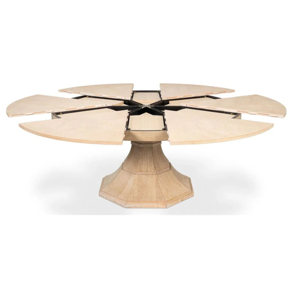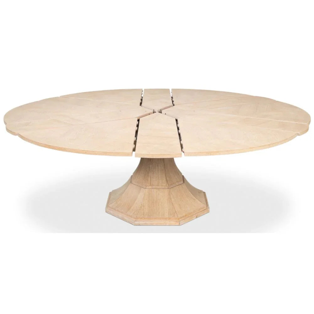 Il tavolo da pranzo Giselle Jupe in rovere sbiancato fonde un fascino senza tempo con la funzionalità quotidiana. Il piano rotondo sfoggia un design a spina di pesce, mentre la base intagliata aggiunge eleganza. Realizzato in rovere massello, si espande facilmente ed è perfetto per pranzi intimi o per accogliere gli ospiti con stile.