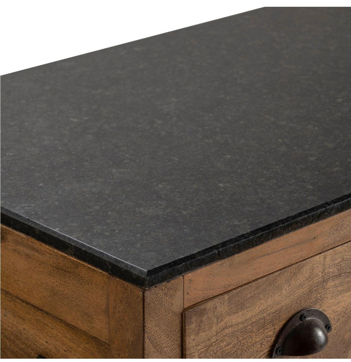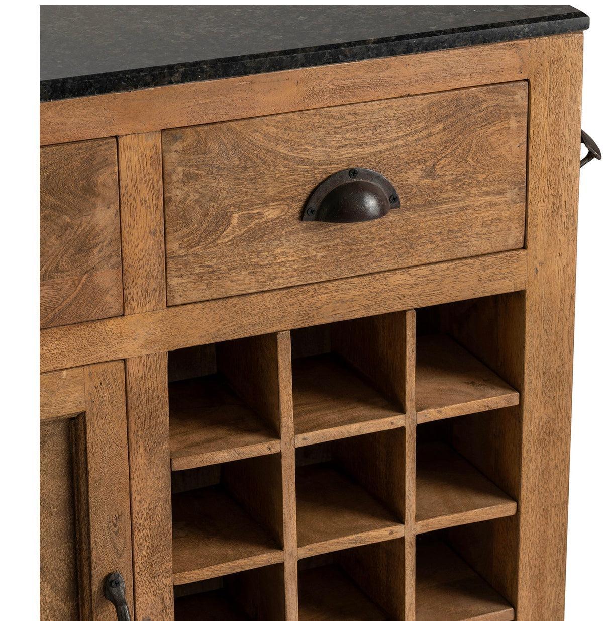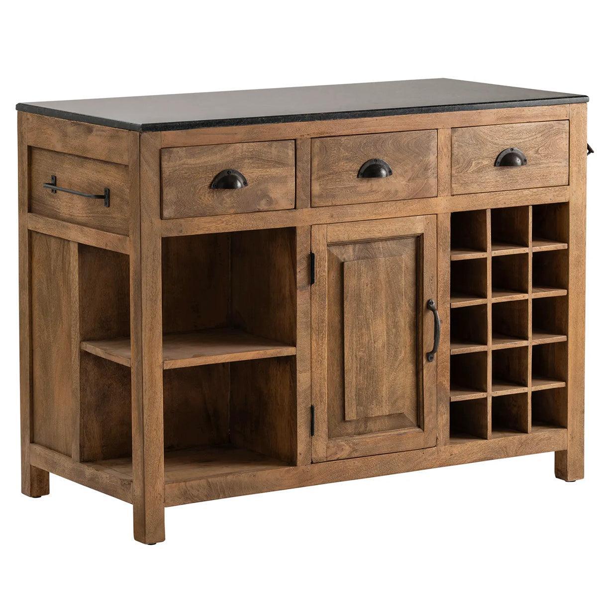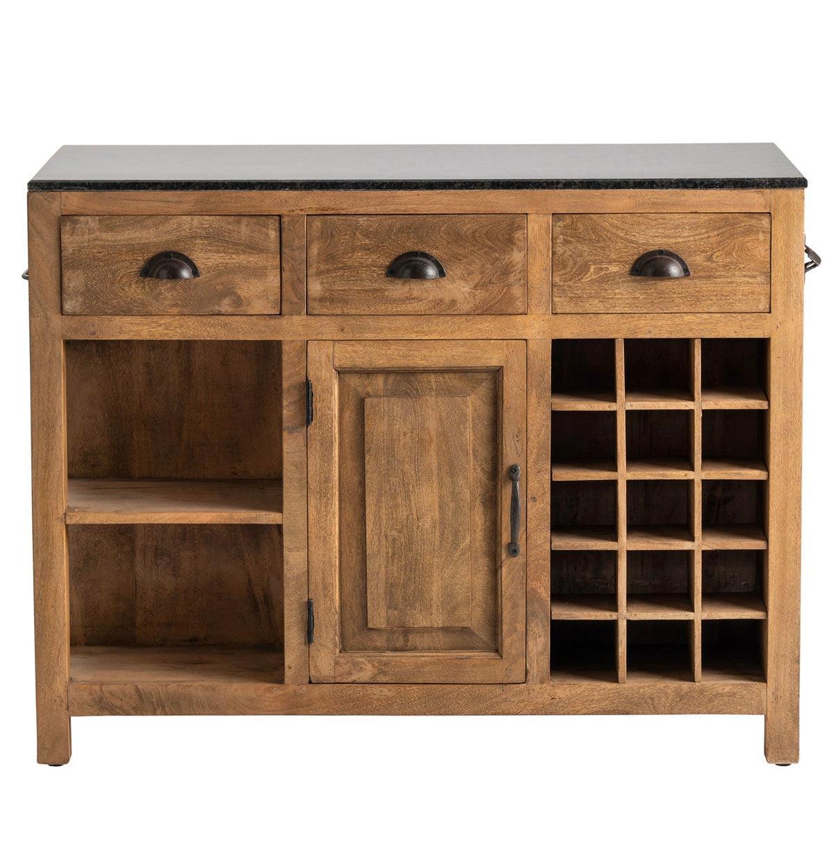 Aggiungi spazio versatile per riporre oggetti e sedute al cuore della tua casa con l'isola da cucina Granite Top Farmhouse! Questa splendida isola da cucina con piano in granito è realizzata in legno massello di mango, rifinita in una calda tonalità rustica per completare il tuo spazio. Tre pratici cassetti sono pronti per riporre utensili, asciugamani e altro ancora, mentre un portabottiglie da 15 scomparti attende il vino d'annata che preferisci. Un mobile centrale nasconde uno o due elettrodomestici e un ripiano angolare aperto ti permette di esporre un paio dei tuoi pezzi preferiti tenendoli sempre a portata di mano. Il retro di questa grande isola da cucina è aperto, così puoi aggiungere degli sgabelli da bancone. Semplici accessori in metallo aggiungono un interessante contrasto. Fantastico!