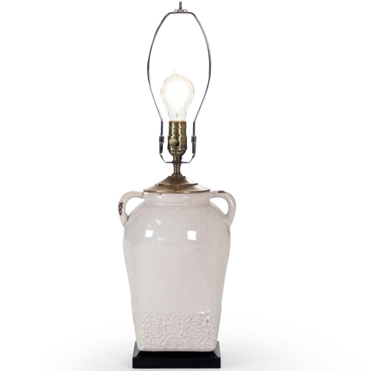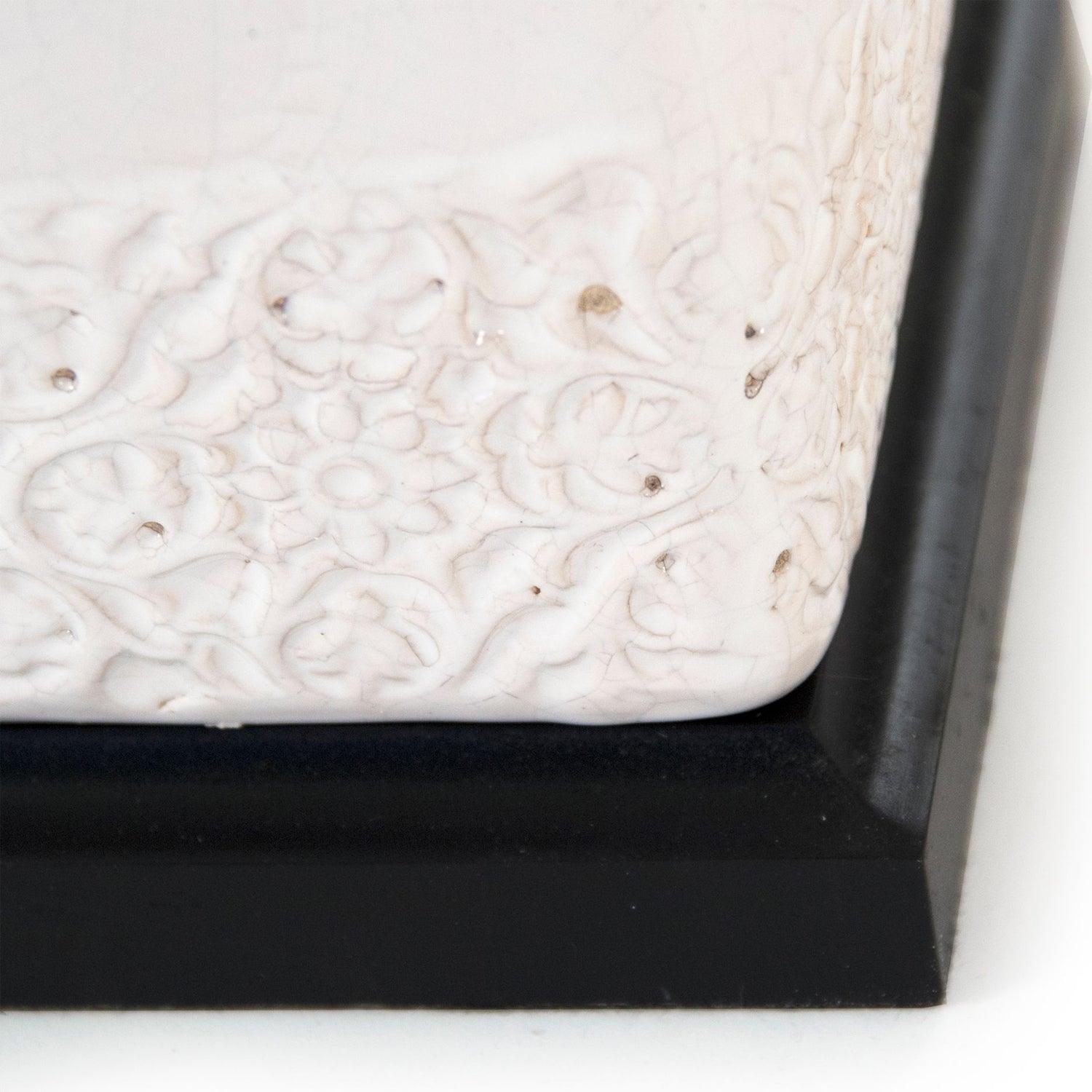 Splendida nella sua semplicità, questa lampada in ceramica smaltata bianca con incisioni floreali è posta su una base nera e vanta un paralume in tela di iuta.