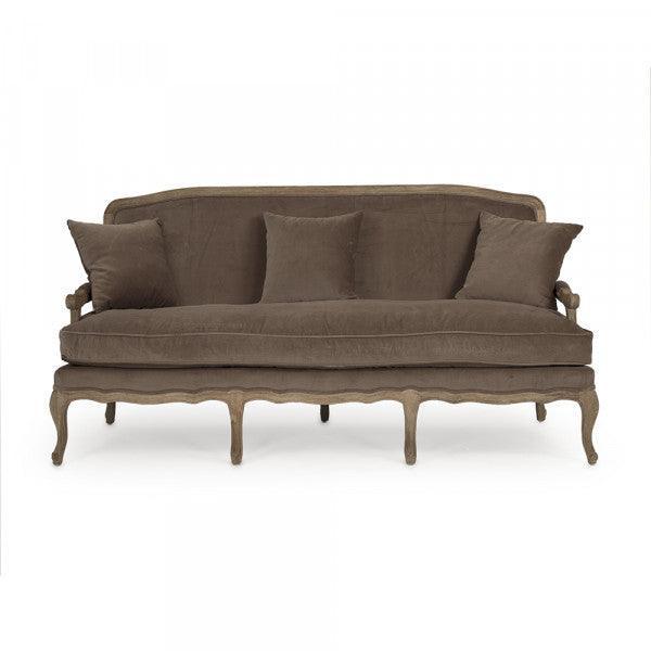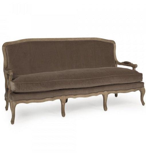 Il divano in velluto marrone francese offre una splendida combinazione di comfort e stile europeo. Rivestito in morbido velluto di lino marrone e poggiato su una base splendidamente intagliata, presenta gambe cabriole e raffinati dettagli. Un paio di morbidi cuscini offrono il tocco finale perfetto, mentre la finitura in legno grigio-marrone dorato lo rende un pezzo che si abbina a qualsiasi ambiente.